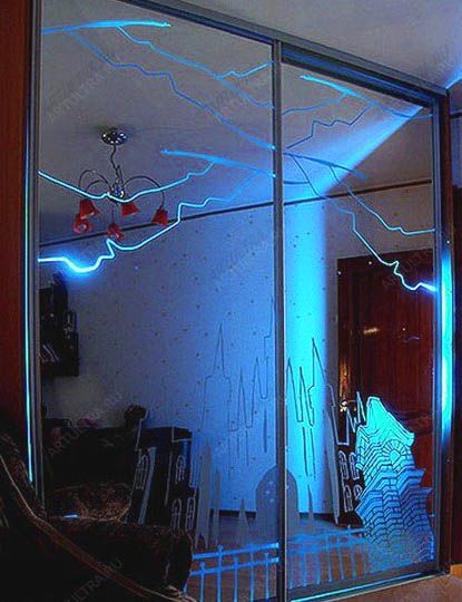 Как правило, в качестве дверей для шкафа купе выбирают или обычные стекла или зеркальные поверхности, на которые наносится рисунок. И в том, и в другом случае используется специальное пескоструйное оборудование, с помощью которого на стеклянные и зеркальные поверхности можно нанести абсолютно любой рисунок.