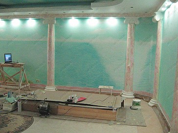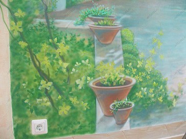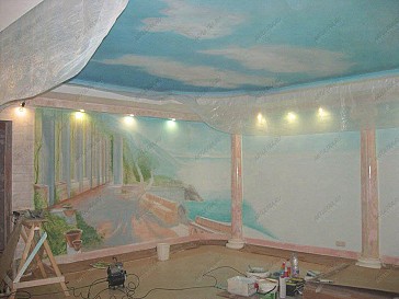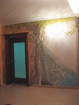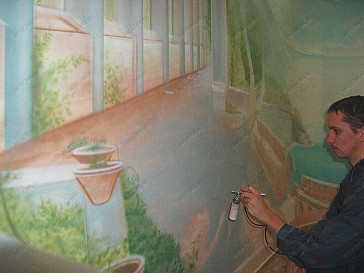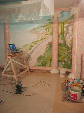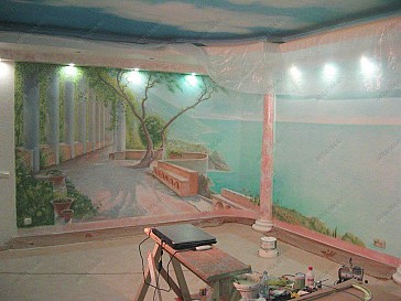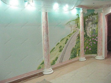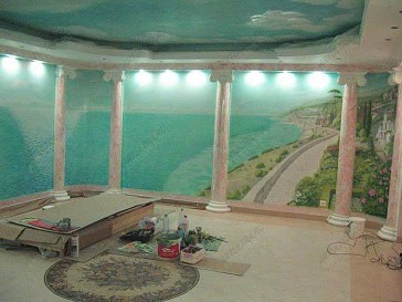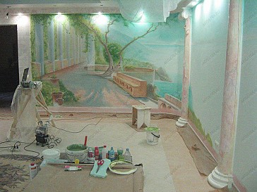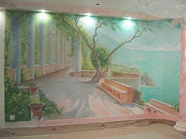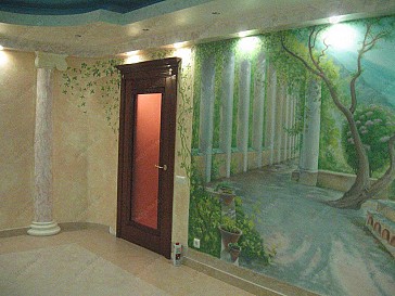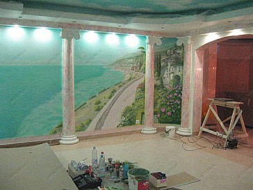 Художественная роспись квартир способна из малогабаритного городского жилья сделать шикарные хоромы, которым будет завидовать даже владелец загородного особняка. И художники-дизайнеры нашей студии с радостью помогут Вам не только расписать стены и потолок, но и определиться с выбором сюжета, который бы максимально соответствовал и Вашему интерьеру, и Вашим пристрастиям. В данном проекте перед нами стояла задача, «перенести» обычную городскую квартиру в парк, который расположен на берегу реки. Естественно, что без росписи-обманки такую трансформацию произвести невозможно, поэтому художественная роспись квартиры была выполнена в виде рисунка на перспективу. Само собой пришло решение обыграть композицию так, чтобы комната производила впечатления парковой террасы. В итоге, когда Вы заходите в комнату начинает казаться, что это не закрытое помещение, а прекрасный парк, наполненный зелеными насаждениями и свежестью реки. Для поддержания настенной росписи было решено расписать потолок под небо, что не только «подняло» потолочное перекрытие, но и добавило в общую атмосферу ощущение свободы и простора. Необходимо отметить, что в создании нужной атмосферы не последнюю роль сыграли и грамотно расположенные осветительные приборы, которые не только подсвечивают художественную роспись квартиры, но и успешно имитируют парковые фонари. Благодаря тому, что в своей работе мы использовали акриловые краски, настенная и потолочная роспись может похвастаться естественными цветами и максимальной реалистичность. А акриловый лак, которым покрыта поверхность стен и потолка, позволит владельцам квартиры производить влажную уборку, без опасения испортить рисунки. |