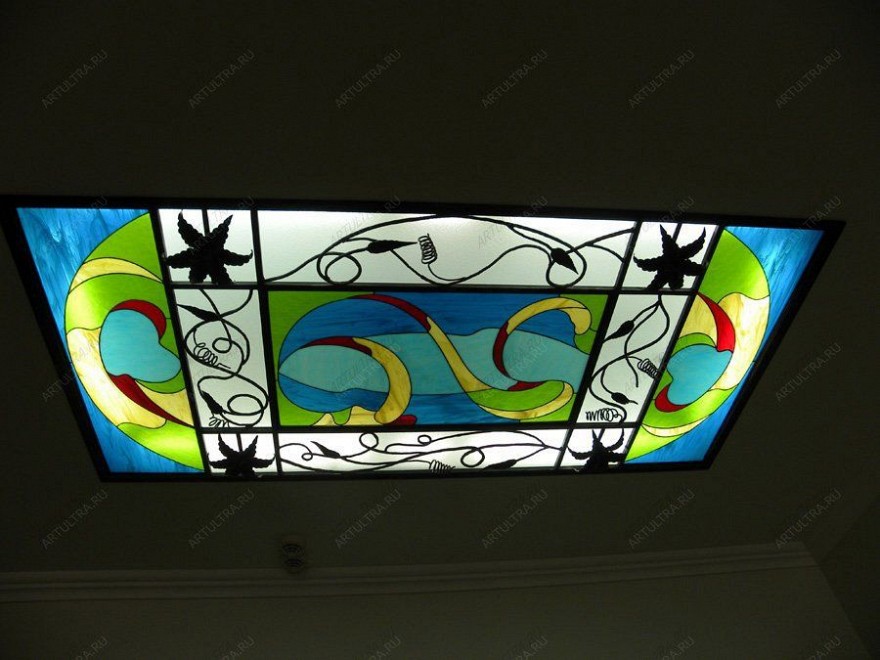 Встроенная умело организованная подсветка стекла, играя цветами, создаст неповторимую и особую атмосферу. Кованый витраж, станет изюминкой потолка для любого интерьера, за исключением, пожалуй, совсем строгого и без единого отступления от правил стиля, к которому относится стиль «Ампир».
