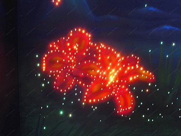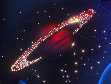 Во-первых, рисунок наносился с помощью аэрографа, который позволяет плавно переходить из тона в тон, и создавать уникальные цветовые переливы. Во-вторых, мы использовали флуоресцентную краску, которая под воздействие ультрафиолетовых лучей придает изображению фантастический вид. И, в-третьих, для усиления эффекта мерцания звезд и других элементов рисунка, мы воспользовались оптоволокном, которое позволяет не только регулировать цвет и яркость сияния, но и создавать дополнительные эффекты в виде «северного сияния» и падающих звезд.