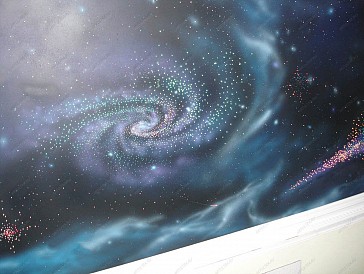 Потолок в виде звездного неба – это одна из самых популярных потолочных росписей, благодаря которой удается полностью преобразить любой интерьер. Потолок, расписанный нашими художниками, позволит Вам наполнить дом загадочным сиянием звезд и непередаваемой атмосферой романтизма и волшебства. Мы все привыкли, что звездное небо у нас над головой безмятежное и немного загадочное. Наш же заказчик захотел чтобы его личное небо оставаясь загадочным, было наполнено жизнью и движением. Именно поэтому наш художник изобразил своеобразные звездные «завихрения», которые благодаря оптоволокну каждый раз выглядят по-разному. Подобные метаморфозы превратили потолок в виде звездного неба из статичного элемента в живой « организм», который поражает своей непредсказуемостью и реализмом. Временами кажется, что перед нами самые настоящие космические просторы, наполненные неизведанными и таинственными небесными телами. Потолочная роспись существенно повлияла на визуальное восприятие всего помещения, теперь потолки стали казаться выше и интереснее. Да и весь интерьер приобрел изысканный и немного таинственный вид. Потолок в виде звездного неба «убрал» потолочное перекрытие, открыв взору многогранность ночного неба и его завораживающие картины. Добиться такого результата нам помог аэрограф, благодаря которому художникам удалось со всей реалистичностью изобразить и воздушные потоки, и звездные скопления. А акриловая краска, которую мы использовали, позволила нам во всей красе продемонстрировать краски и красоту звездного неба. |