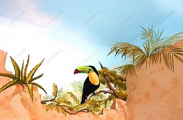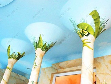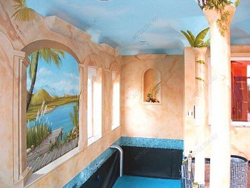 Роспись колонн позволяет превратить статичные, и чаще всего, мешающие архитектурные элементы, в оригинальное и эффектное украшение интерьера. Дизайнеры нашей студии предложат Вам множество интересных решений по оформлению колонн в Вашем доме, а художники быстро и качественно распишут их по индивидуально разработанному эскизу. Заказчик данного проекта обратился к нам в студию с заказом комплексной росписи помещения, в котором располагается бассейн. Колонны, расположенные в бассейне, натолкнули наших дизайнеров на интересное решение, которое позволяло сделать это помещение светлым и просторным. Благодаря росписи колонны превратились в стволы деревьев, а вместо потолка появилось голубое безмятежное небо. На стене наши художники «прорезали» лишнее окно, из которого открывается потрясающий вид на реку и деревянный помост. В комплексе интерьерная роспись позволила кардинально изменить визуальное восприятие всего помещения. Мягкий пастельный цвет стен делает помещение легким и просторным. А голубое небо над головой несет в себе спокойствие и умиротворение. Очень интересной деталью являются фрагменты полуразрушенных стен, которые позволяют представить себя в старом дворце какого-нибудь фараона. А красочный тукан, который заглядывает в помещение сквозь разлом в стене, вызывает улыбку, и придает всему интерьеру особой реалистичности. Как Вы можете убедиться, роспись колонн позволяет полностью изменить восприятие этих архитектурных элементов, и превратить их из архитектурного недостатка в интересное и эффектное дизайнерское решение, украшающее весь интерьер. |