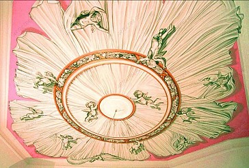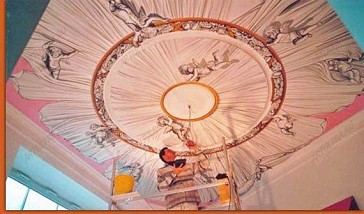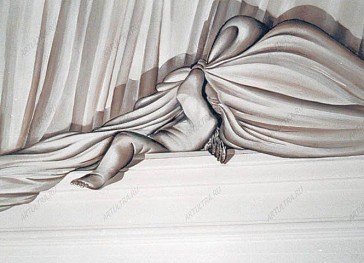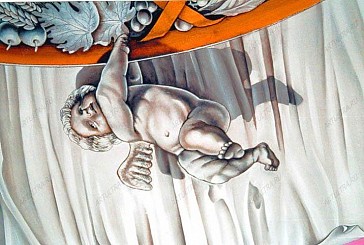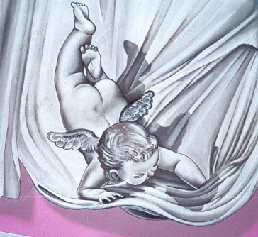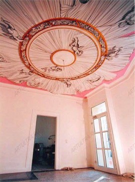 Роспись потолка «Ангелы» – это не только художественное оформление потолка, но и возможность конструирования пространства, визуального изменения формы и размера всего помещения в целом. Художники нашей студии, опираясь на свой многолетний опыт работы, могут быстро и качественно выполнить настенную и потолочную роспись любой степени сложности, и тем самым преобразить Ваш интерьер. Разрабатывая эскизы для наших заказчиков, мы всегда принимаем во внимание не только все их пожелания, но и архитектурные и стилевые особенности помещения. Например, в данном проекте высокие потолки в помещении нашего заказчика, сразу же натолкнули наших художников на мысль, что идеальным решением для потолочной росписи будет сюжетная композиция в стиле барокко, поскольку именно для этого стиля характерна торжественность, присущая помещениям с высокими потолками. Кроме того роспись потолка «ангелы», которую нам заказал заказчик, тоже как нельзя лучше соответствует всем требованиям барокко, к которым относятся общая пышность, помпезность, и объемные фигуры. В своей работе художники пошли на определенный риск, поскольку отказались от традиционного изображения ангелов, резвящихся среди пушистых облаков. Основным фоном выступила имитация тканевой драпировки, в которой ангелы как будто играют в прятки. Основные элементы сюжетной композиции выполнены в черно-белых тонах, что позволило создать эффект «парящего» потолка. А роль цветового акцента взяли на себя пробивающийся сквозь драпировку ткани розовый фон потолка, и яркая окантовка имитации лепнины. Такое сюжетное и цветовое решение росписи потолка «Ангелы» позволило визуально «опустить» потолок, но при этом не потерять общую торжественность помещения. Скорее даже наоборот потолочная роспись добавила помещению еще большей торжественности, благодаря чему комната стала похожа на настоящий парадный зал какого-нибудь дворца. |
