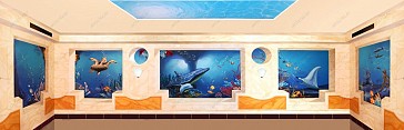 Роспись стен «подводный мир» – это идеальный вариант для художественного оформления помещений, связанных с обилием воды, таких как бассейн или ванная комната. Специалисты нашей студии с удовольствием предложат Вам самые разнообразные варианты оформления помещений любого типа, разработают индивидуальный эскиз, опираясь на Ваши пожелания и предпочтения, а также быстро и качественно перенесут все рисунки на поверхность стены или потолка. Как правило, при выборе сюжета для художественного оформления бассейнов не возникает затруднений, поскольку это помещение само собой подразумевает морскую тематику. И в самом деле, в каком другом месте настолько гармонично и уместно будет смотреться роспись с сюжетом подводного мира? Заказчики данного проекта тоже не стали выдумывать ничего экстраординарного, и отдали предпочтение традиционной тематике подводного мира. Особенностью же этой росписи стали «иллюминаторы», которые позволяют почувствовать себя настоящим капитаном Немо, бороздящим глубины океана на подводной лодке «Наутилус». Не менее изысканно и гармонично смотрится и потолочная роспись, способствующая расслаблению и релаксации. Необходимо отметить, что потрясающей реалистичности картин нам помог добиться аэрограф, с помощью которого можно добиваться удивительно тонких и плавных переходов из тона в тон. Поскольку бассейн, это помещение с повышенной влажностью, роспись стен «подводный мир» была выполнена влагостойкими акриловыми красками. А для дополнительной защиты настенной и потолочной росписи был использован акриловый лак. |