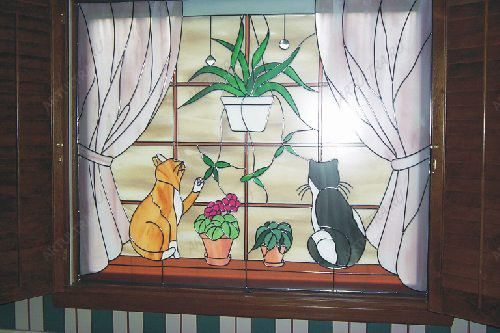 Заказчик данного витража решил не останавливаться на изображении одной кошки, и выбрал целый сюжет, в котором есть и красочные цветы и изящные кошки, и даже гардины, затейливо обрамляющие витраж. Поскольку витраж установили в оконный проем, то картина стала логическим дополнением окна, и украсила не только интерьер дома, но и его экстерьер. Можно только представить себе восхищение прохожих, которые, увидев витраж кошки, будут долго «ломать себе голову» над тем, настоящие это животные или нет.