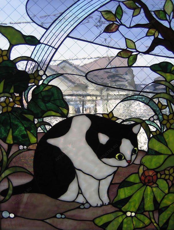 Изготавливая витраж кот, мы использовали фактурные прозрачные стекла, которые, не препятствуя прохождению естественного света, позволяют скрыть происходящее в доме от посторонних глаз. Кроме того, лучи солнца, попадая на фактурные и разноцветные участки витража, создают в интерьере волшебные узоры, наполняющие атмосферу праздничным настроением и ощущением волшебства. А глаза кота начинают «гореть» благодаря чему временами кажется, что на окошке, лениво наблюдает за свои хозяином, сидит самое настоящее животное, которое вот-вот спрыгнет и горделиво удалиться.