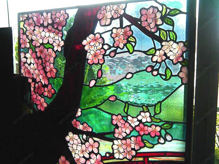 В данной работе заказчик отдал предпочтение именно японскому стилю, поскольку он наиболее точно отображает его мировоззрение и восприятие окружающей обстановки. А поскольку японская вишня является не только символом станы восходящего солнца, но и символом благополучия и чистоты, то не вызывает удивления тот факт, что наш заказчик выбрал сакура витраж в качестве остекления своего окна. Ведь намного приятнее видеть в окне не серые стены домов, а прекрасные и нежные цветы сакуры, которые наполняют дом вечной весной, спокойствием и умиротворением.