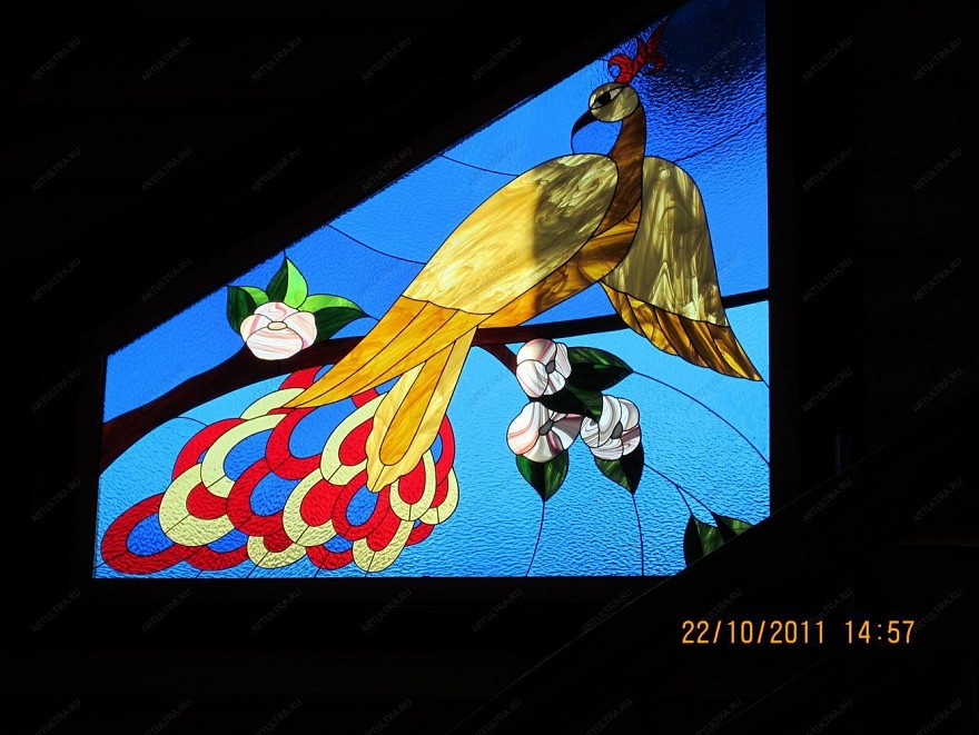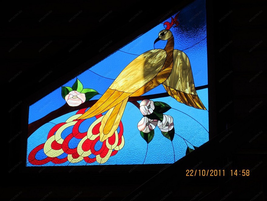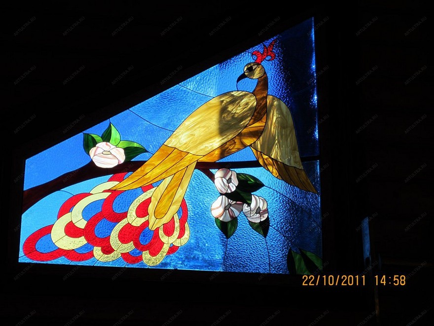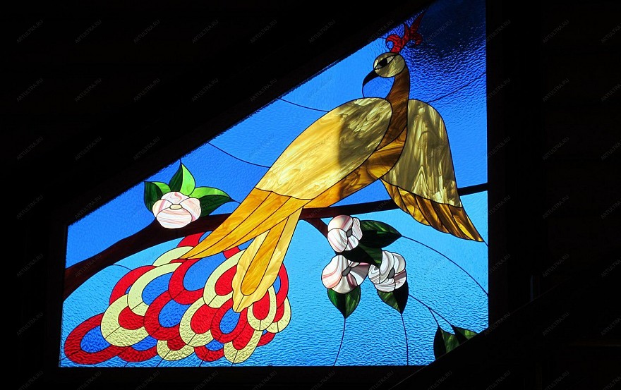 Витраж «Жар-птица» выглядит ярко, необычно, диковинно. Он чудесным образом украсит интерьер детской комнаты. Каждое утро эта удивительная птица будет заглядывать в окно, даря детям прекрасное настроение, сказку. Данный витраж сделан в технике Тиффани из разноцветных фактурных стекол. 145 деталей вырезаны по эскизу, плотно подогнаны друг к другу и скреплены при помощи оловянного припоя и медной проволоки. Эксклюзивная ручная работа.