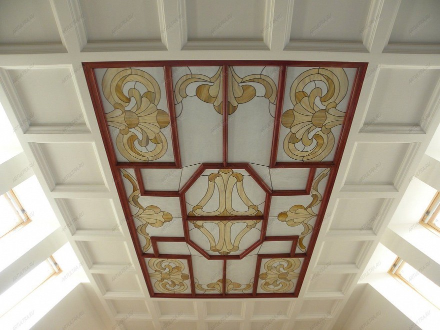 Витраж во французском стиле выполнен в технике Тиффани, что дает ему ряд преимуществ, например, перед аналогичным классическим витражом. Стекла складывают в мозаику и соединяют с помощью тонкой медной ленты, в результате чего получается легкая, но прочная конструкция, которая может стать украшением потолка. Кроме этого, техника Тиффани делает орнамент очень выразительным и объемным. Разглядывать такой витраж можно часами: хитросплетение рисунка, причудливая игра света в стеклянных гранях притягивают как магнит. Для людей с богатым воображением это просто находка. К тому же разглядывание такого рисунка успокаивает нервы, что важно для современного человека, который живет в бешеном ритме жизни.