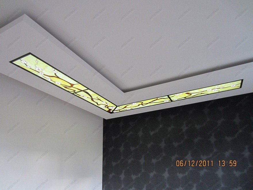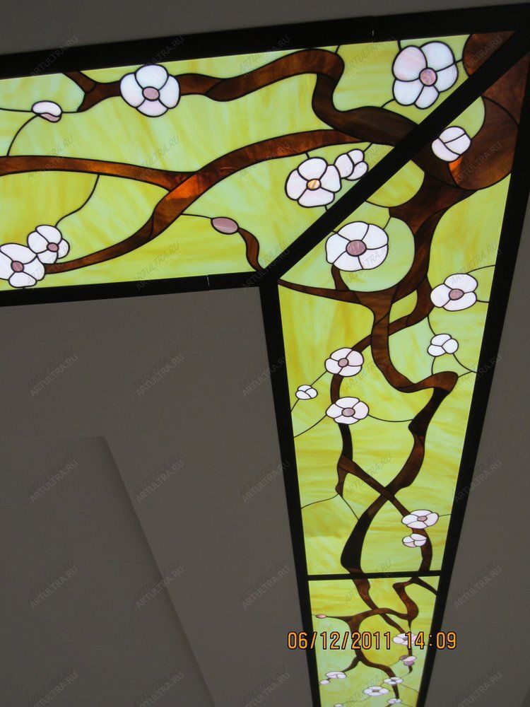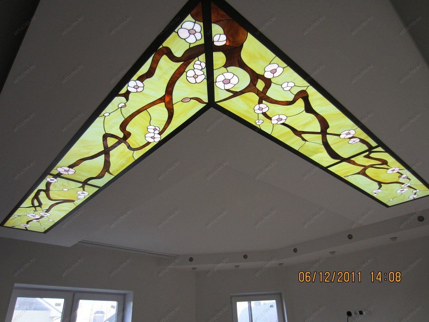 Витражные потолки являются эффектным вариантом декора любой комнаты, будь это спальня, гостиная или даже детская. Подобные витражи похожи на сказочные картинки и могут изыскано вплетаться в любой стиль интерьера, но наиболее подходящими, разумеется, являются китайский и японский стили. Витраж, как говорилось выше, выполнен в технике Тиффани, которая позволяет создавать завораживающие композиции из стекла. Множество тщательно подобранных деталей были аккуратно обернуты медной лентой, после чего спаяны друг с другом посредством прочного свинцово-оловянного припоя. Стоит отметить, что в темное время суток такой витражный потолок смотрится еще более выразительно, поскольку многочисленные стеклянные элементы начинают переливаться грациозным мерцанием и блеском.