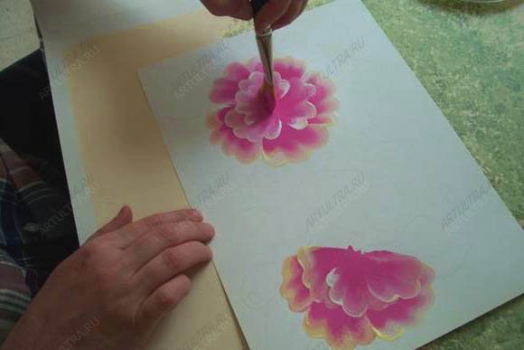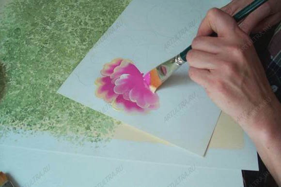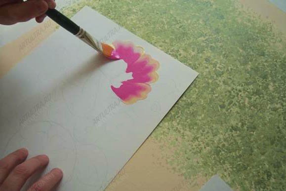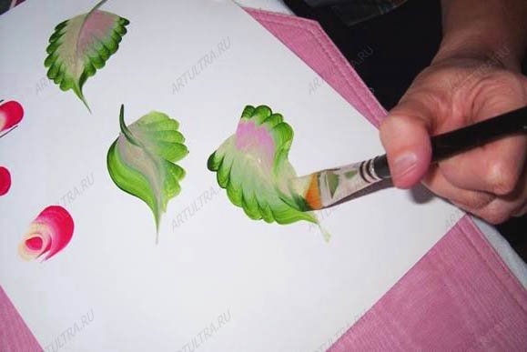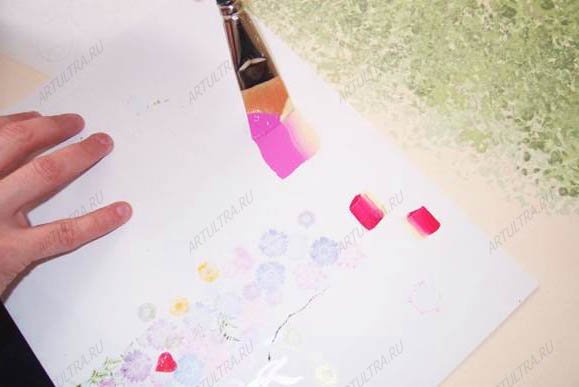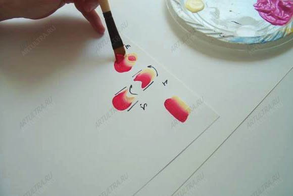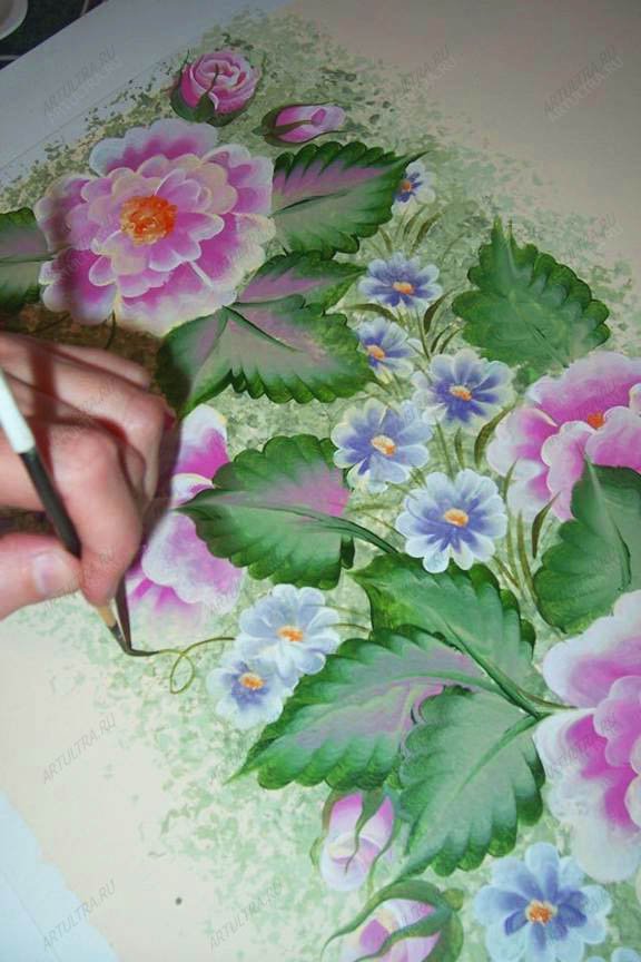 Шаг 1. Перед тем, как приступать к нанесению рисунка на стену, необходимо потренироваться на картоне. Для этого нам понадобятся: краски, кисти, тренировочный карандашный эскиз, и лист картона на котором мы будем подбирать консистенцию краски. Она нам понадобиться такой густоты, чтобы можно было закончить элемент рисунка одним мазком (не жидкая, но и не слишком густая). Шаг 2. На меньшую кисточку со скошенным ворсом набираем сразу два цвета (на один конец кисти – один цвет, на другой конец – второй цвет), и проводим прямую линию как можно дольше. Такой нехитрый прием даст нам возможность определить, насколько густой должна быть краска, чтобы мазок получился максимально длинным. Теперь попробуем нарисовать небольшую дугу. На фотографии можно увидеть начало мазка (черная прямая линия) и направление кисти (стрелка). Точно так же рисуем дугу в обратную сторону. Если две дуги совместить, то мы получим бутон розы. Шаг 3. Затем возьмем более широкую кисть со скошенным ворсом, наберем на нее два других цвета и опять проведем прямую линию максимальной длины. Шаг 4. Консистенцию краски определили, основное движение усвоили, и теперь можно приступать к самому рисунку. Берем свой тренировочный эскиз и наносим волнообразные мазки (минимум – 2 волны, максимум – 4). Каждая волна образует отдельный большой лепесток. Постоянно проворачивая лист наносим один мазок за другим. При этом очень важно, чтобы при выполнении мазка рука не отрывалась. Шаг 5. Точно таким же образом рисуем внутренние лепестки (они должны быть немного поменьше). Не переживайте если краска еще влажная, получившийся неровным нижний край можно легко подравнять. Рисуя цветок можно использовать маленький фокус: край кисточки с белым цветом можно окунуть в кремовую краску (а можно и наоборот, кремовый цвет в белую краску), и тогда одним мазком Вы сможете нанести сразу три цвета, а при желании и больше. Шаг 6. Теперь рисуем круглый цветок из четырех-пяти лепестков. Обратите внимание, как в одном мазке смешиваются белый и кремовый цвета. Точно такими же волнообразными мазками рисуем внутренние лепестки. Нужно постараться закончить внутренний последний мазок таким образом, чтобы в центре не просматривался лист бумаги, а мазок у края был ровный. Шаг 7. Зеленый фон можно нанести при помощи натуральной мочалки, обрезанной в форме шара. Наносить фон можно с использованием различных оттенков зеленого цвета. Для того чтобы получилась реалистичная серединка цветка, можно взять дешевую кисточку, обрезать ее, и «тыкательными» движениями нанести белый и желтый цвета. Если во время тренировочного упражнения консистенция краски Вас полностью удовлетворила, то можете смело начинать роспись. Шаг 8. На маленькую тонкую кисточку, которой будет прорисовываться зелень, можно тоже набрать сразу два оттенка. Толщина мазка варьируется нажимом на кисть (вспомните, как Вы учились каллиграфии), а каждый элемент должен наноситься одним мазком. Плавно отрывая руку с кисточкой от бумаги, начинаем движение снизу и заканчиваем вверху очень острым окончанием. Старайтесь, чтобы бутоны и зеленые элементы у Вас не получились одинаковой формы. Шаг 9. Теперь приступаем к листикам. Берем опять картонку, на которой разучивались основные мазки, и пробуем нарисовать листик. Они выполняются практически также как и лепестки цве
