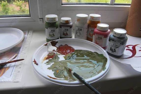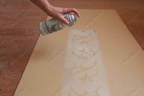 | Шаг 1. Перед началом работ необходимо подготовить все инструменты и материалы, которые могут понадобиться. Это трафарет, краски, трафаретный клей, палитра (вместо нее можно использовать одноразовую тарелку), кухонная губка и бумага или полиэтилен, чтобы укрыть пол. Шаг 2. Как правило, очень сложно сразу выбрать подходящий цвет в готовом виде, поэтому обычно приходится смешивать краски, добиваясь «благородного», а не «мультяшного» цвета. Поэтому следующий этап заключается в смешивании красок. После нескольких экспериментов с различными цветами, опытным путем мы получили два нужных нам оттенка – терракотовый и оливковый. Шаг 3. Бумагу или полиэтилен расстилаем на полу, сверху выкладываем трафарет обратной стороной вверх, и покрываем его аэрозольным трафаретным клеем. С клеем старайтесь не переусердствовать, поскольку перед Вами не стоит задача намертво приклеить шаблон, необходимо всего лишь зафиксировать его на нужном участке стены. Главное, чтобы элементы рисунка шаблона довольно плотно прилегали к поверхности стены – это исключит подтекание краски под трафарет. В общем, здесь должно присутствовать чувство меры, нельзя наносить клея слишком много, но и скупиться не стоит. Шаг 4. Поскольку мы решили наносить узор от камина, приклеиваем трафарет возле него. Для этого прикладываем трафарет липкой стороной к поверхности стены и аккуратно прижимаем его с помощью бумаги, стараясь не повредить.