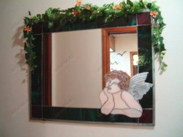 Ангел на зеркале – витраж, созданный в технике Тиффани. Необходимо учесть, что выполнить такой декор можно на зеркале, толщина которого не меньше 4 мм. Техника заключается в том, что множество фрагментов качественного и удивительного по своей фактуре стекла марки Spectrum обрабатываются особым образом стеклорезом, после чего каждый элемент оборачивается липкой медной лентой. Далее фрагменты стекла собираются воедино, для чего используется свинцово-оловянный припой. В результате получается необыкновенный по своей красоте и оригинальности рисунок, поскольку каждый этап его создания выполнялся вручную.