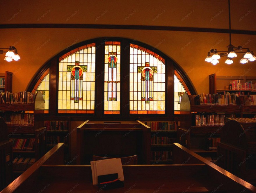 Библиотека с витражом придаст помещению выразительность и особый стиль. Такой витраж является достаточно выдержанным и строгим декоративным оформлением окна, что полностью соответствует назначению таких заведений.
