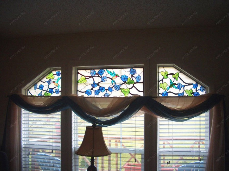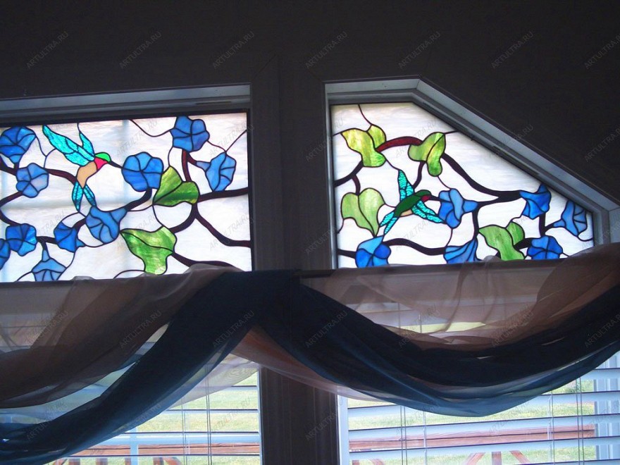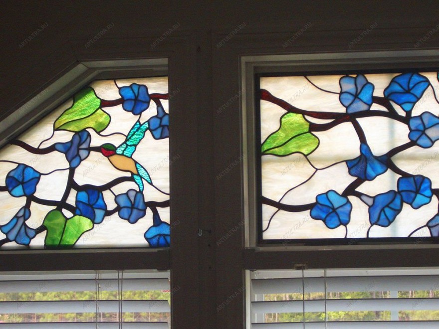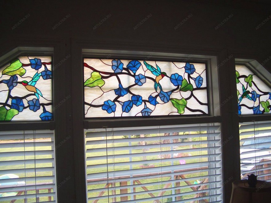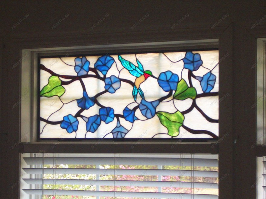 Цветы из стекла – витражи, выполненные в технике Тиффани с изображением очень нежных колокольчиков, о чем свидетельствует представленное выше фото. Такой современный и оригинальный декор прекрасно подойдет для окон любых помещений, являясь чудесным и ненавязчивым дополнением к интерьеру.