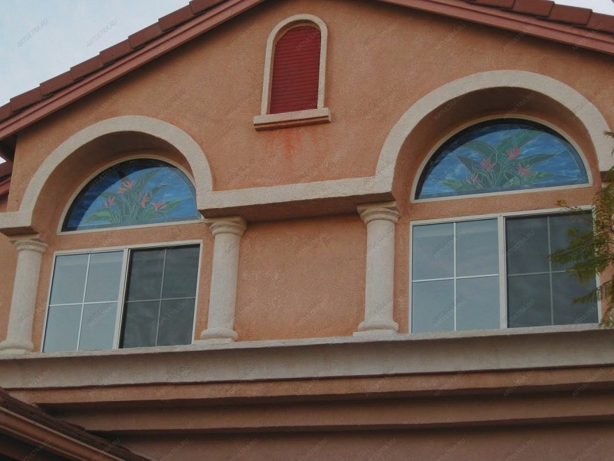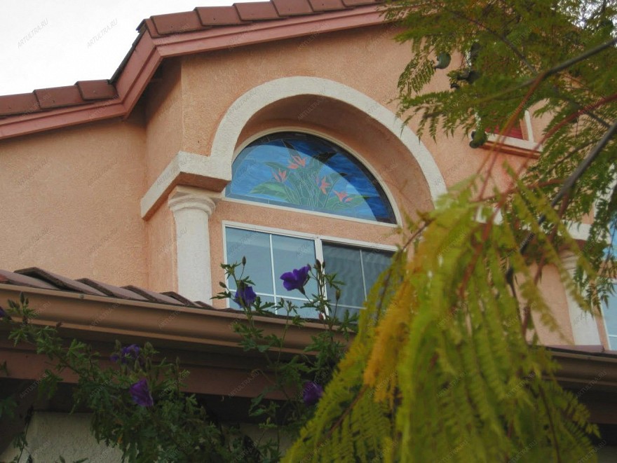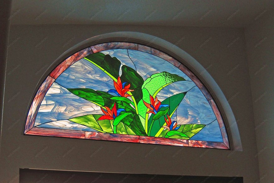Цветы на витражах станут оригинальным современным элементом декора для фрамуги окна. Витраж с таким рисунком замечательно подойдет для декорирования любых помещений и комнат, поскольку представляет собой универсальную композицию с изображением цветов.