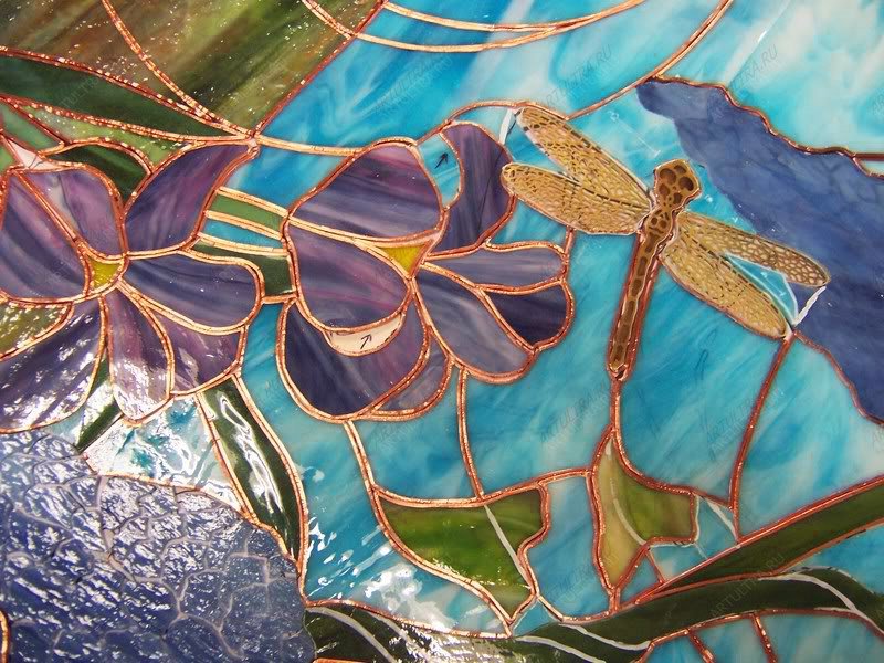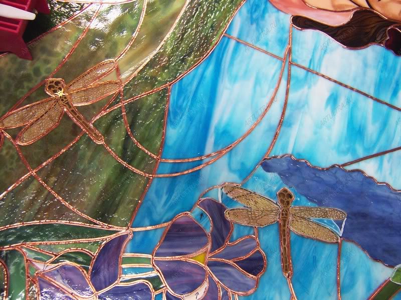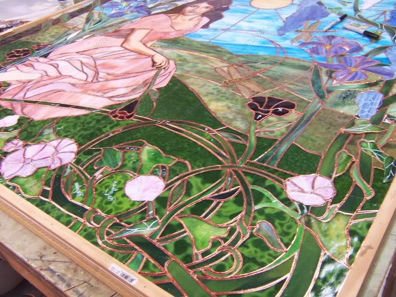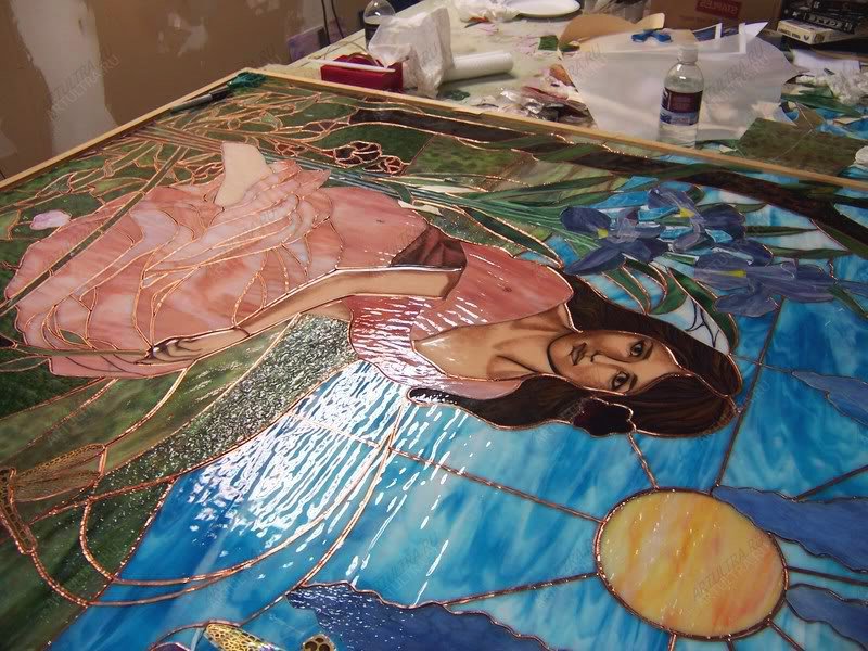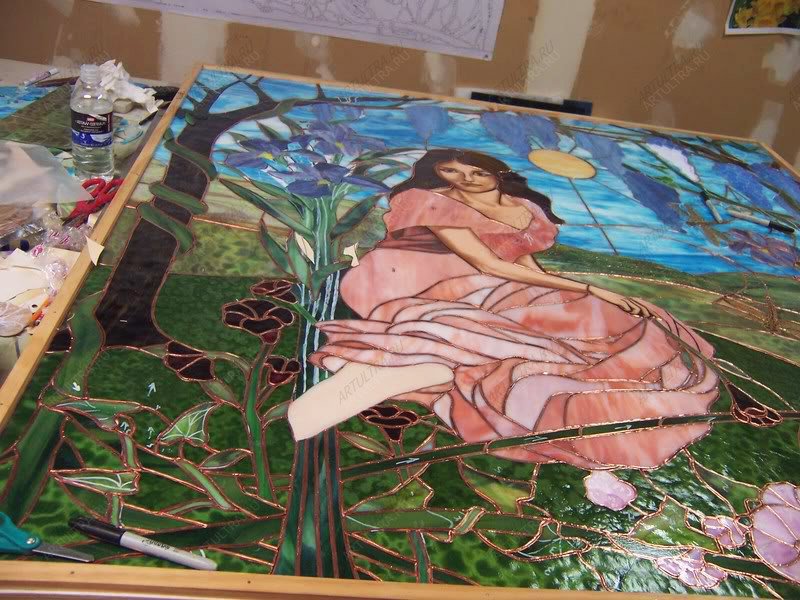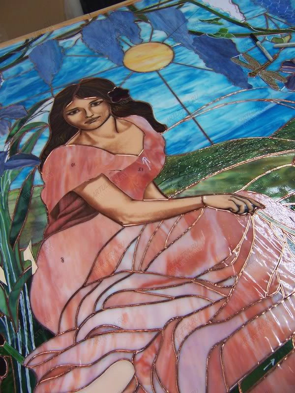 Картина выполнена в техниках Тиффани и роспись. Тиффани предполагает обработку каждого фрагмента медной лентой и последующую их сборку при помощи припоя. Художественная роспись производится при помощи специальных акриловых красок. Изображение, выполненное в данных техниках, обладает необычайной выразительностью и выглядит крайне живописно, при этом с течением времени не выгорает и не деформируется.