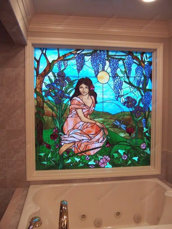 Следует отметить, что использование художественных витражей является приемом, способным привнести в интерьер особую ноту. Ведь игра света в цвете всегда непредсказуема и неожиданна, т.к. практически невозможно предугадать, как она «зазвучит» в данном интерьере. И, тем не менее, очень часто так случается, что «звучание» создает именно ту необходимую ноту, от которой начинает «звенеть» весь интерьер. В данном случае речь идет именно о девушке из витража, выполненной посредством заливной техники и способной сыграть в интерьере именно ведущую ноту.