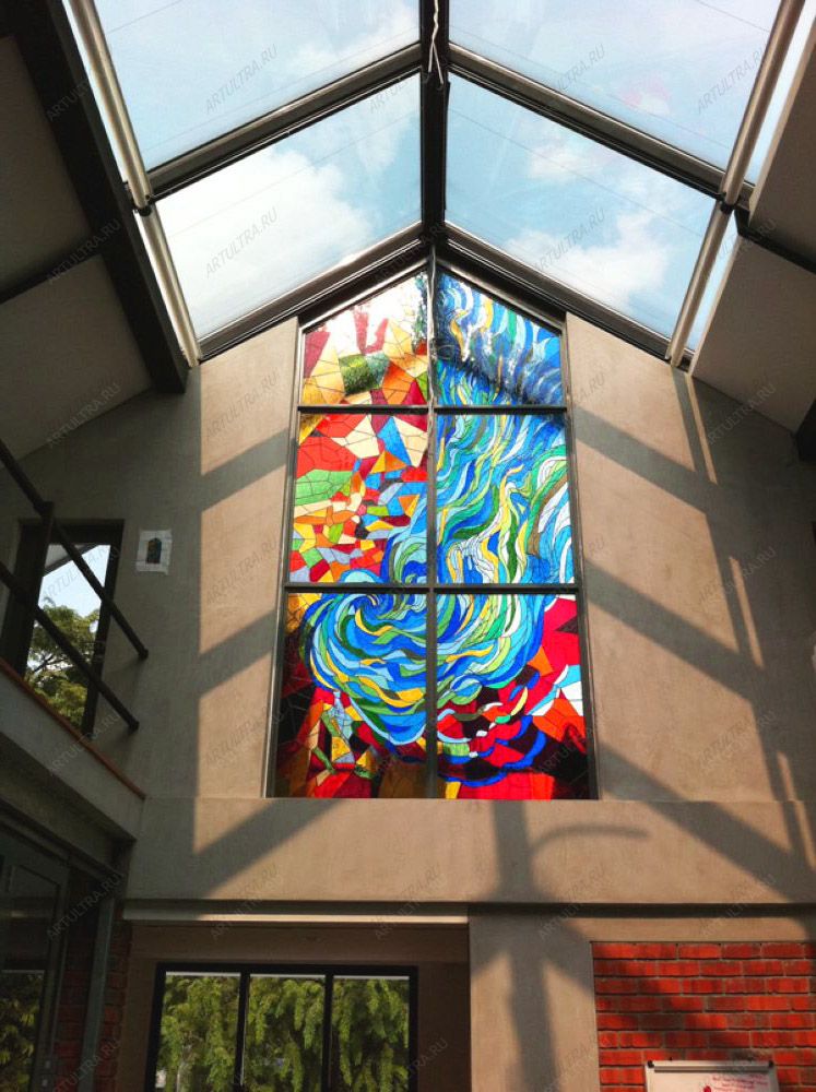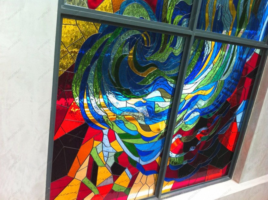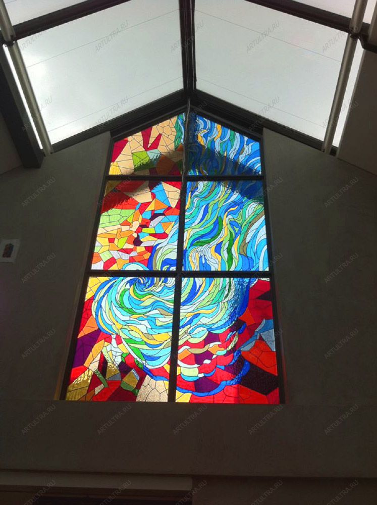 Особый эффект достигается, если крыша дома также выполнена из стекла. Дневной свет будет больше проникать в дом с витражом, создавая непередаваемую игру света. Рисунок, выполненный из насыщенных, ярких оттенков стекла, создает особую атмосферу, сравнимую с атмосферой праздника и торжества. В яркий солнечный день витраж будет сверкать, переливаясь в солнечных лучах, играя всеми цветами радуги. Это будет неописуемое для созерцания зрелище не только для хозяев дома, но и для его гостей. Важно отметить, что абстрактный рисунок будет удачно гармонировать с любой стилистикой интерьера, будь это классический стиль или минимализм (стиль хай-тек). Большое витражное окно изготавливается из 526 фрагментов стекла, благодаря чему готовое изделие имеет довольно габаритные размеры и станет апофеозом дизайнерской мысли.