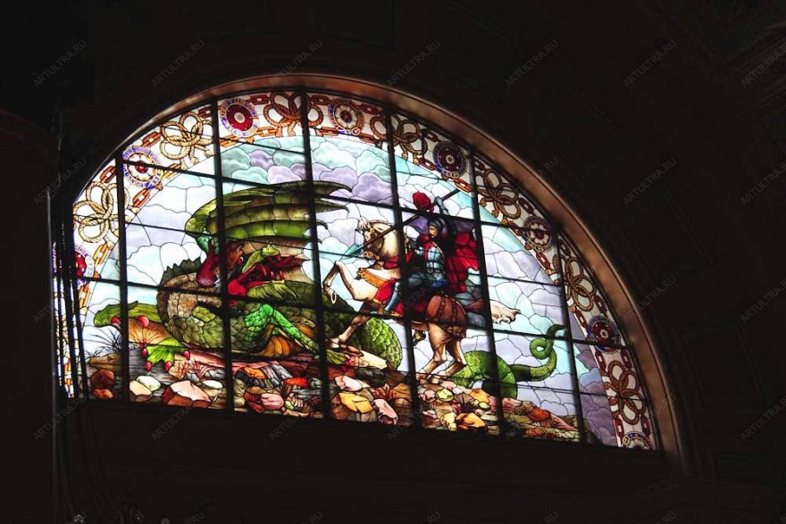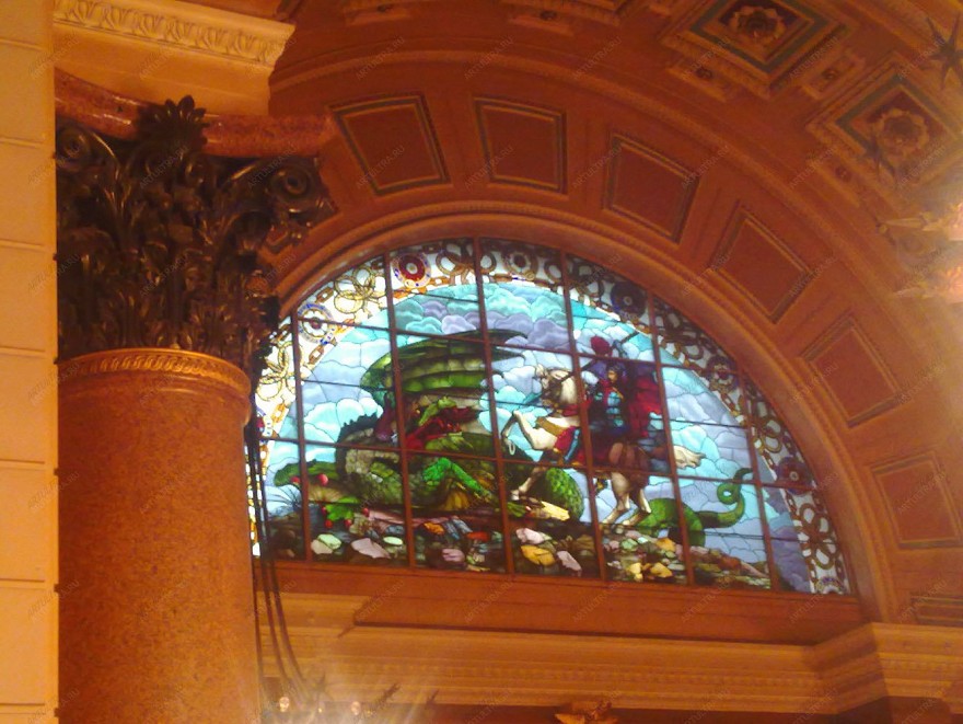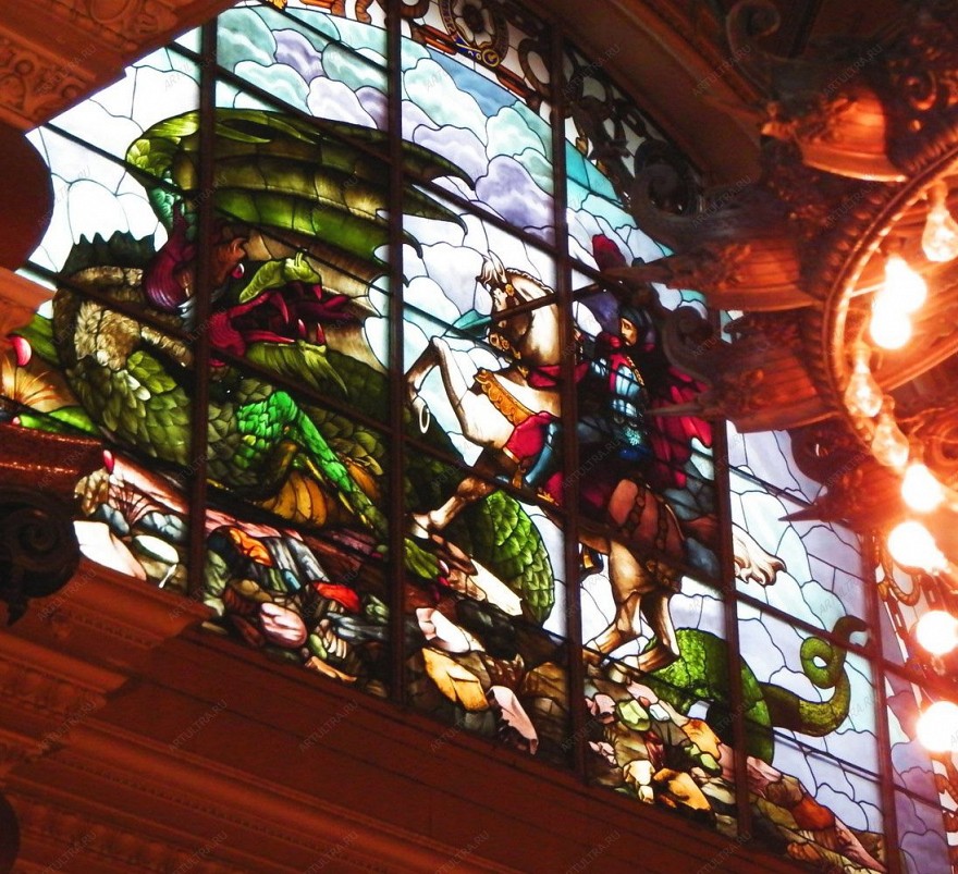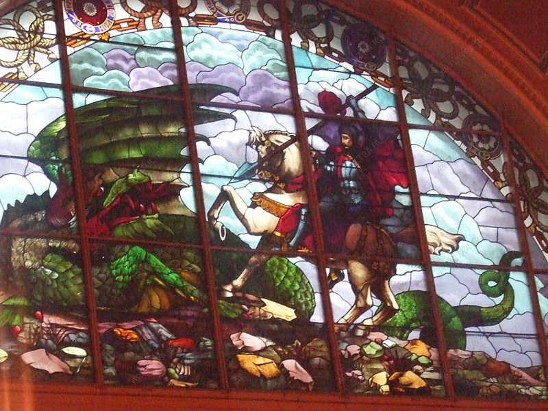 На витраже изображен всадник, убивающий дракона. Такой рисунок считается символом победы над трудностями и призван поддерживать силу духа. Поэтому окно с витражом такой тематики станет отличным украшением гостиной или рабочей комнаты. Классический стиль росписи по стеклу с драконом гармонично вольется в любой интерьер и станет ярким акцентом в помещении. Уход за изделием не требует особых реверансов: витраж моется как обычное стекло. Главное условие – не пользоваться растворителями или абразивами и тогда оно прослужит вам гораздо дольше заявленного гарантийного срока в 12 лет.