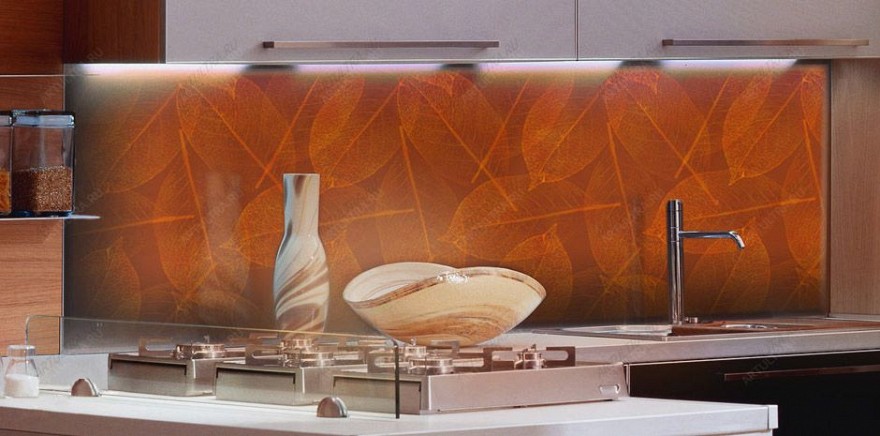 Фартук со стеклопечатью привнесет живости в интерьер кухни. Встроенная подсветка усилит визуальный эффект и создаст комфортные условия для создания кулинарных шедевров. Доминирующий цвет фартука оранжевый – цвет поздней осени – великолепное решение для дизайна кухни. Такой фартук добавит новизны в общий вид кухни, она станет более нарядной и запоминающейся.