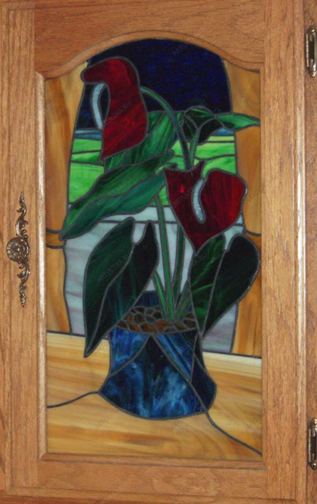Витражные фасады кухни изготавливаются из фрагментов цветного стекла, которые оборачиваются медной лентой и соединяются друг с другом с помощью оловянно-свинцового припоя. В работе задействовано 126 фрагментов стекла ярких и насыщенных оттенков. Сложность выполнения витражных фасадов средняя, поэтому длительность их производства составит порядка 14 рабочих дней. В работе используются исключительно высококачественные безвредные виды стекла, которые не содержат токсичных веществ. Для удаления частиц необходимо периодически протирать дверцы мягкой тканью с использованием неабразивных чистящих средств.