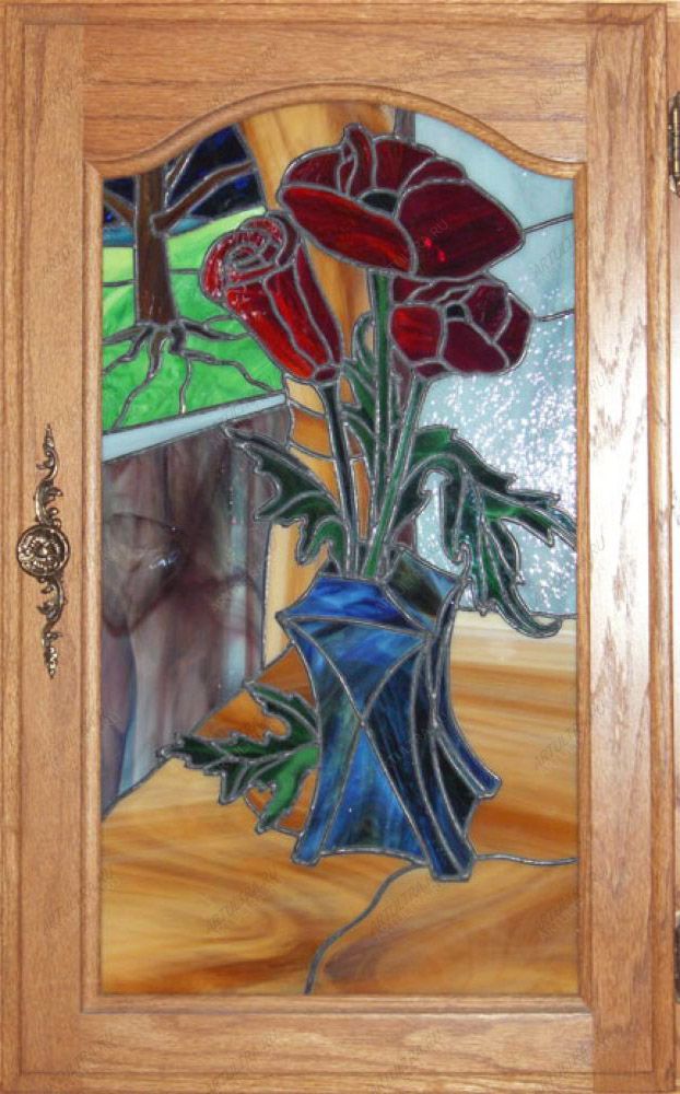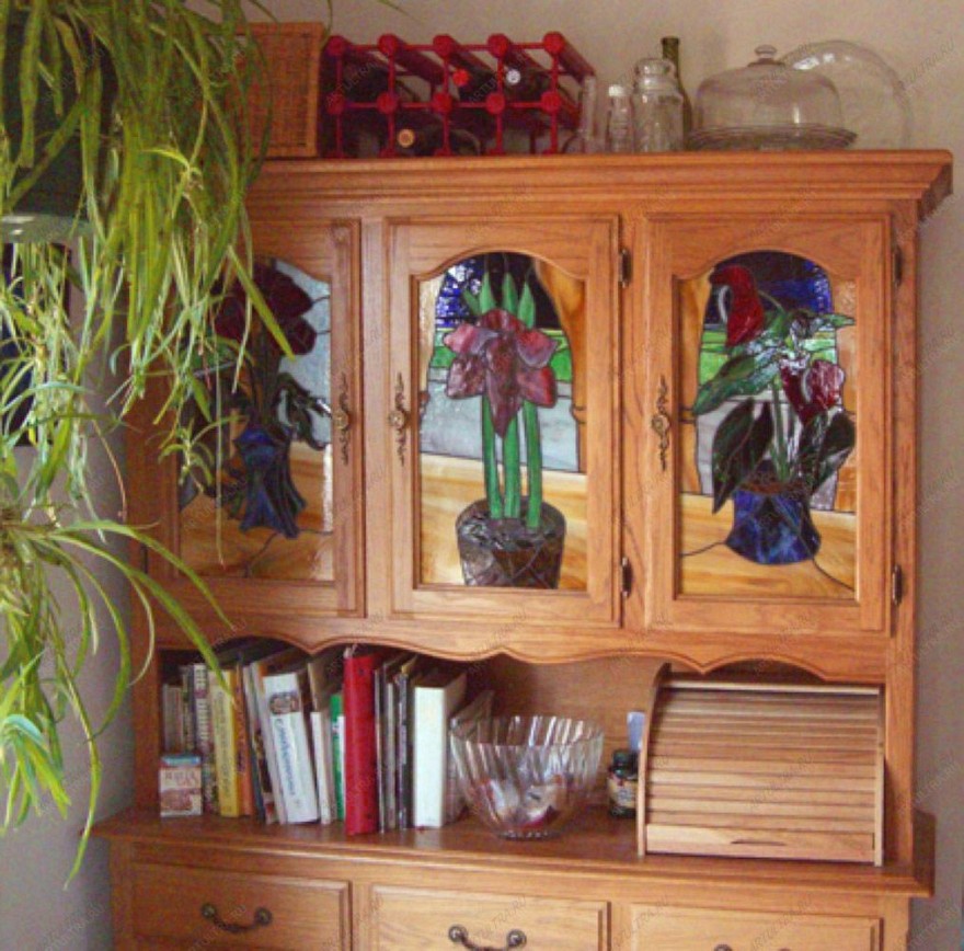 Витражные фасады кухни – отличное современное дополнение к вашему интерьеру. Декорирование дверец кухонного гарнитура можно назвать быстрым и легким способом разнообразить обычный заурядный дизайн интерьера. Разумеется, для этого нужно правильно подобрать витраж, подходящий под общий стиль всего помещения и который гармонично бы вписался в цветовую гамму интерьера. Ну а что касается выбора рисунка, то он тоже должен соответствовать стилю вашей кухни. Правда, если выбирать изображения пейзажей или цветов, как показано на фото, расположенном выше, то такой рисунок практически универсален и подойдет к любому кухонному дизайну.