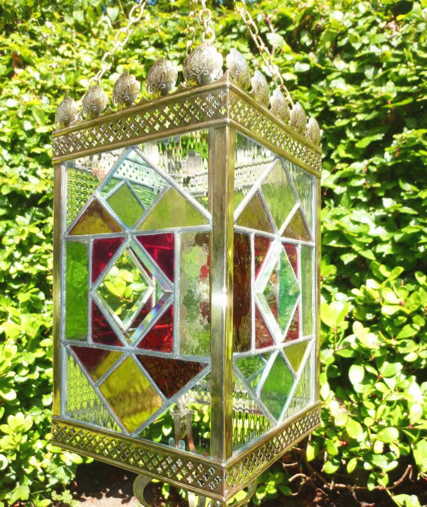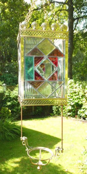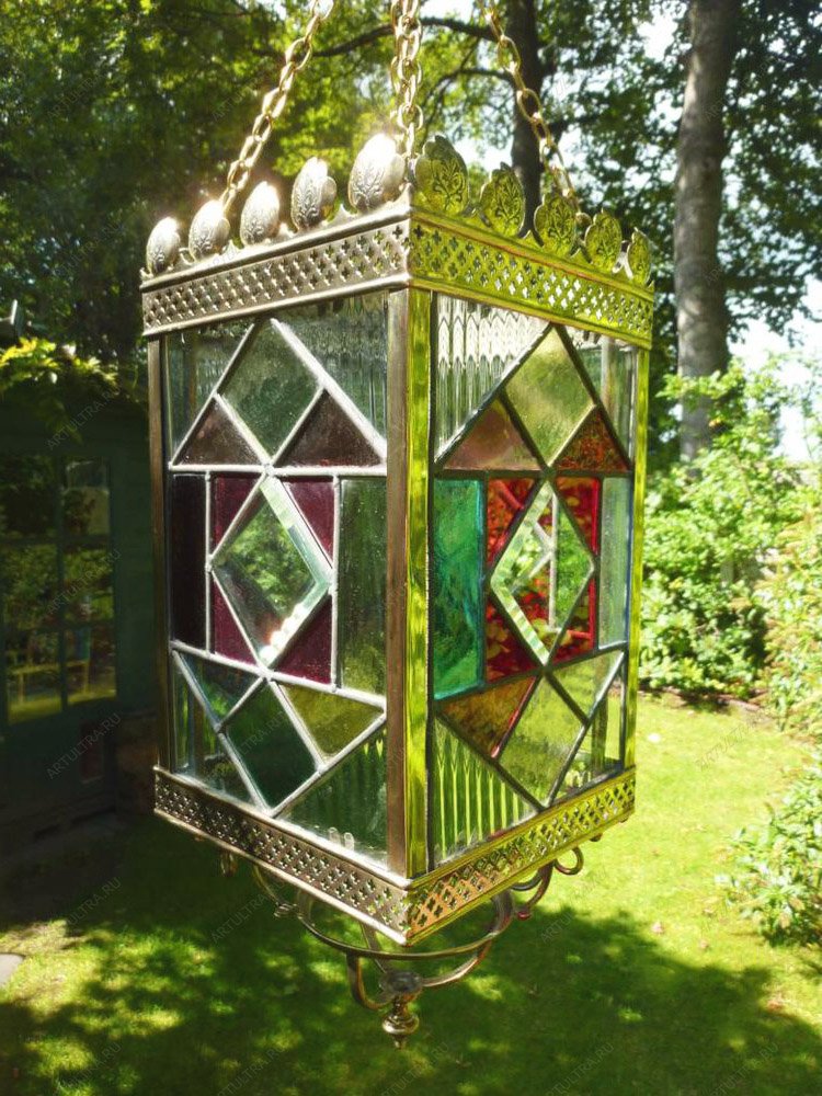 Медная лента усиливает конструкцию, предохраняя ее от повреждений, а свинцово-оловянный припой соединяет 68 стекол, собирая их воедино. Детали прошли тщательную обработку стеклорезом во избежание неточностей. Такие изысканные украшения для дома замечательно смотрятся на террасах, верандах, в гостиных и прихожих. При солнечном свете стекла играют всеми цветами радуги, а вечером в фонарь можно установить свечу, тогда он обретет новый волшебный вид.