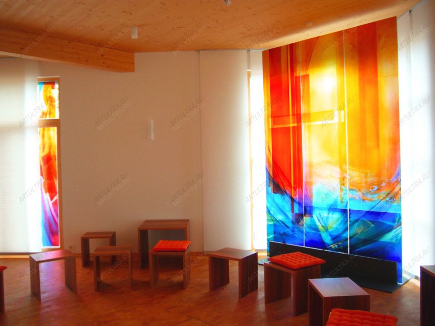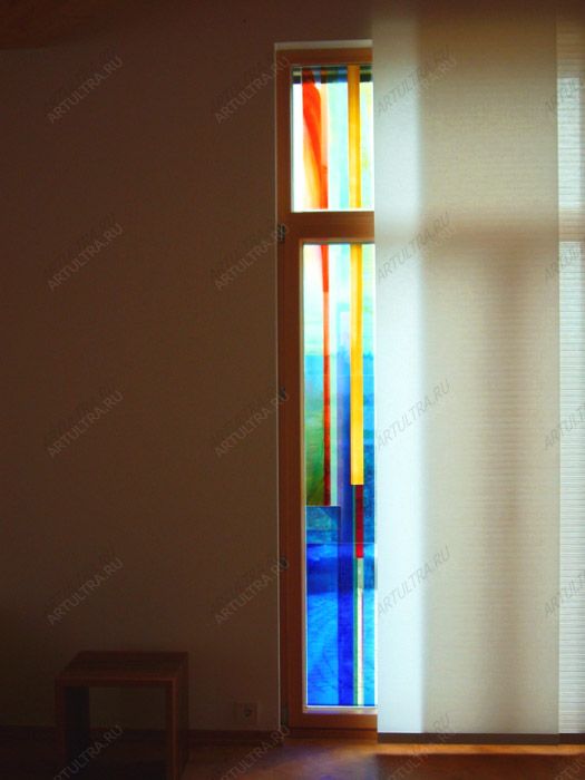 Фотопанно в стекле позволит украсить любой дверной проем или стену, добавив в Ваш интерьер романтичности и выразительным. Яркие жизнерадостные цвета такого витражного рисунка, делают его необыкновенным украшением, ведь на него хочется смотреть снова и снова, разглядывая буквально каждую деталь. Кроме эстетичности, фотопанно в стекле выполняет и практичную функцию, занимаю пустоту в стене, зрительно увеличивая площадь помещения. Сочетание ярко-желтого и холодного синего цвета будет держать в тонусе. Кроме этого, сочетание таких оттенков создаст жизнерадостную атмосферу и будет уместен во многих стилях интерьера, особенно кантри.