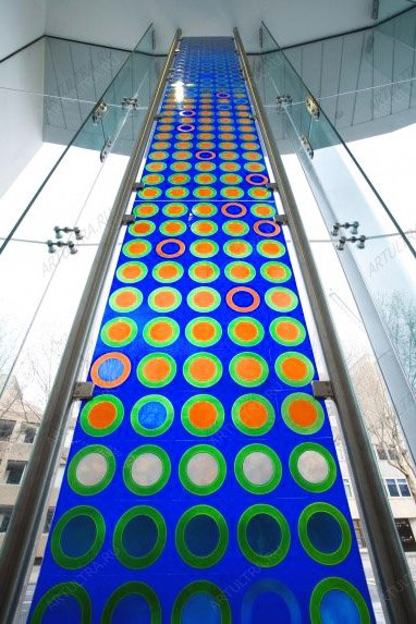 На фотопечати для здания явно преобладает синий цвет, являющийся цветом моря и неба, символизирующий глубину, высоту, а также постоянство, вечность, совершенство и мир. Очень часто его связывают со всем духовным. Поскольку синий является холодным цветом, то большинство людей он настраивает на размышления. В глубинной психологии он связывается с духовной растворенностью. Сложность выполнения фотовитража относится к низкой категории, в связи с чем процесс изготовления изделия займет всего две недели, а гарантия на него составляет 6 лет.