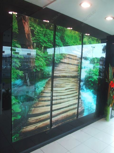 Фотопечать на стене - это прекрасная возможность добавить к интерьеру вашего дома или офиса некую «изюминку», о чем свидетельствуют представленная выше картина. Для фотопечати используют особые чернила, которые, затвердевая под воздействием ультрафиолета, превращаются в тонкую полимерную пленку. Одним из лучших материалов для фотопечати является стекло, поскольку изображения выглядят более четкими, а цвета насыщенными. Еще одно несомненное достоинство такого декора – фотовитраж на стекле легко мыть, поскольку рисунок очень стоек к воздействию мягких мыльных растворов.