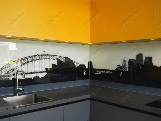 Фотовитраж кухни исполнен путем нанесения фотопечатного изображения на стеклянную поверхность. Такой метод нашел большое применение при оформлении интерьера и дизайна внутренних помещений, поскольку им можно украшать любые стеклянные и зеркальные поверхности различных размеров. Рисунок наносится посредством уф-принтера на поверхность стекла. При этом используются качественные праймеры, не содержащие вредных компонентов. Изображение отличается насыщенностью цветов и стойкостью к воздействию неблагоприятных факторов.