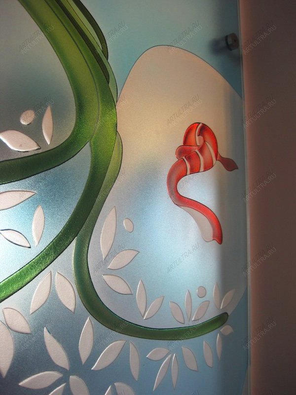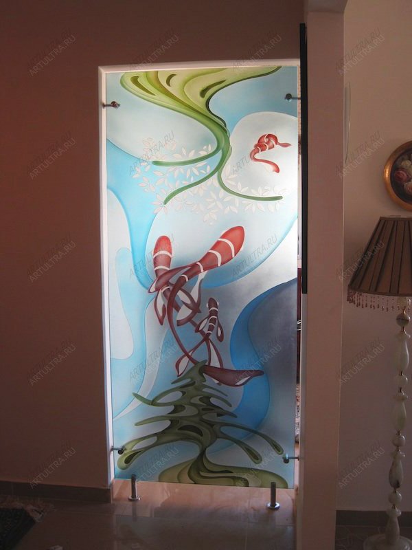 Фьюзинг с рыбами прекрасно украсит проем в стене. Это уникальный, благородный и эффектный рисунок без каких-либо излишеств. Помимо своих декоративных качеств, он прекрасно решит проблему устранения прозрачности стекла, что, безусловно, важно для сохранения приватности.