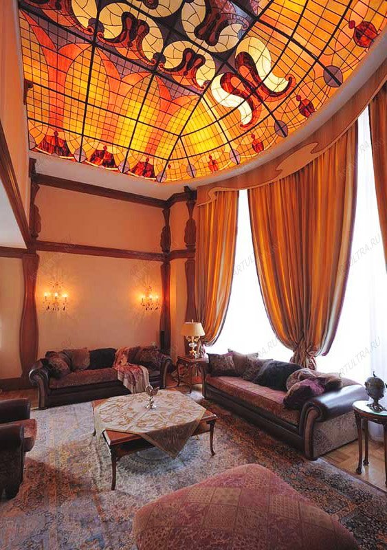 Гостиничные витражи чудесно подойдут в качестве оригинального декоративного оформления потолка таких заведений, как отели и гостиничные комплексы. Такой декор привнесет в интерьер элементы роскоши, изысканности, элегантности, создав эффектный и стильный вид, что непременно поспособствует привлечению многочисленных посетителей и постояльцев.