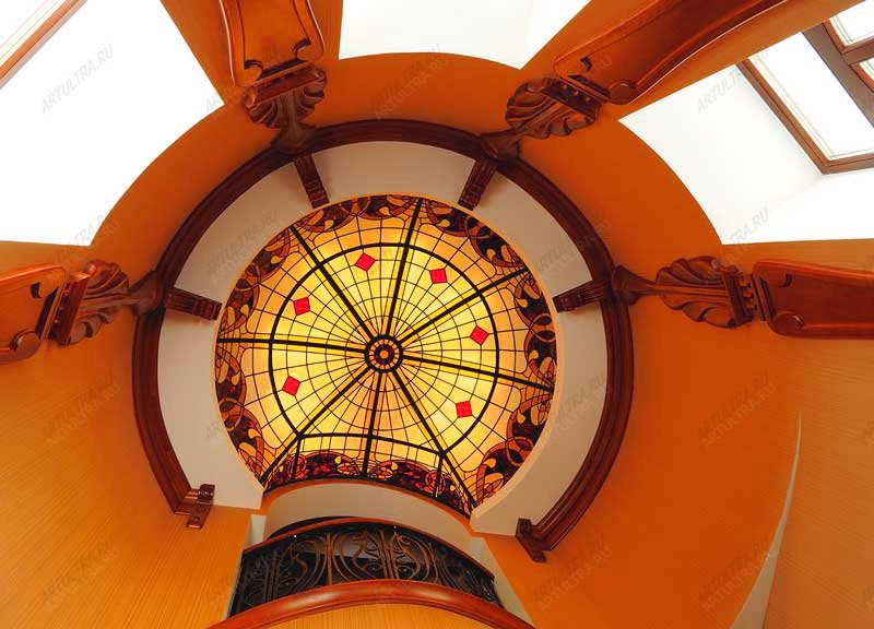 Большими преимуществами потолков, выполненных в технике Тиффани, являются безопасность, нетоксичность, надежность, устойчивость к перепадам температур, а также в случае повреждений, возможность замены отдельных стеклянных элементов. Ну а что касается ухода за витражом, то инструкции совершенно не сложные. Необходимо всего лишь время от времени протирать поверхность стекла мягкой тканью с использованием обычных моющих средств без содержания жестких абразивных частиц.