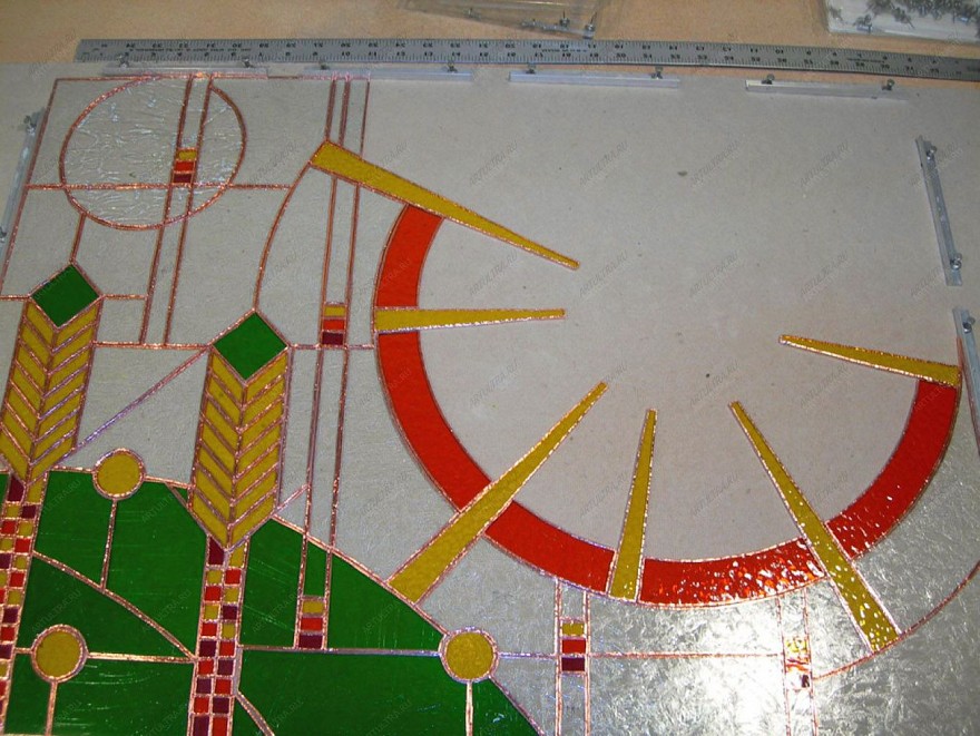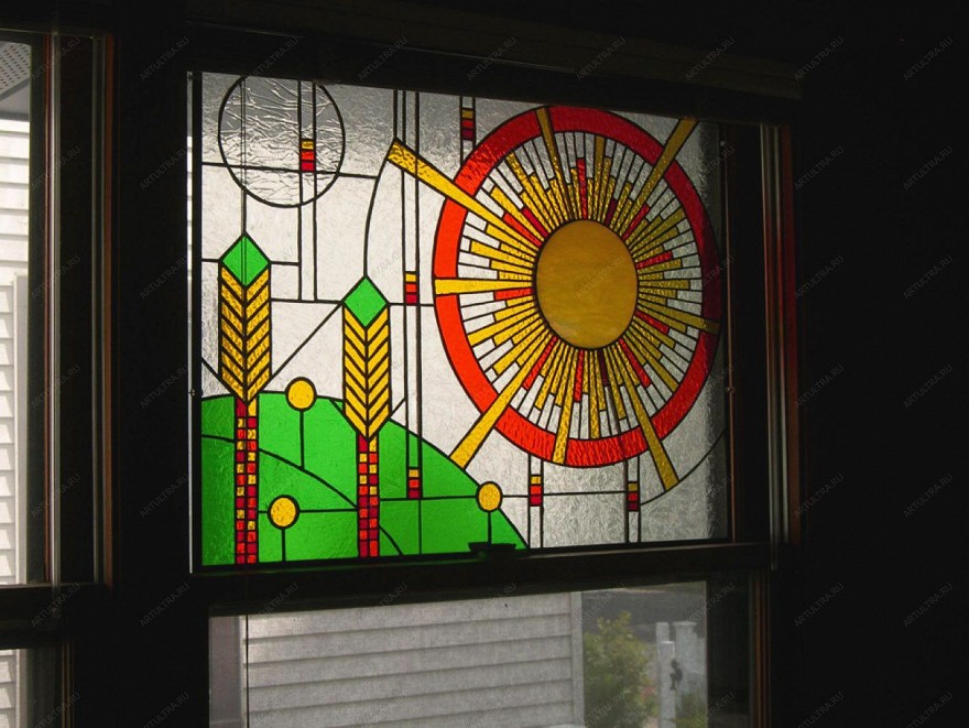 Наиболее подходящим и удачным для рабочей атмосферы является бодрящий мотив с символичным изображением солнечных лучей с использованием насыщенного зеленого, желтого и красного оттенков цветного стекла. Рисунок выглядит очень ярко, красочно и привлекательно, тем самым заряжая находящихся в помещении людей положительной энергией. Такой рисунок способствует отличной трудоспособности и производительности труда, прекрасно тонизирует и вдохновляет офисных сотрудников, что, несомненно, не может не сказаться на результатах выполняемой работы и успешности коллектива в целом.