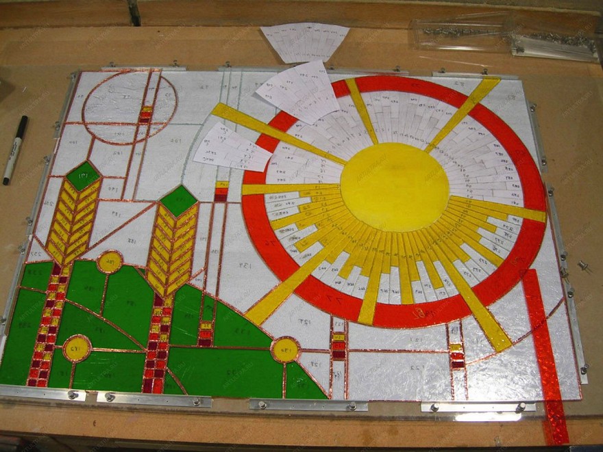 Здесь к нам на помощь и приходит готовый витраж в офис. Это замечательное средство, способное создать благоприятную позитивную рабочую обстановку, а также поднять работникам настроение и творческую активность. В этой области также имеется широкое многообразие в выборе рисунка. Расположить такой витраж можно в оконном проеме или на стене, украсив таким образом офисный интерьер. Витраж состоит из 274 стеклянных фрагментов, соединенных между собой свинцово-оловянным припоем и клейкой медной лентой.