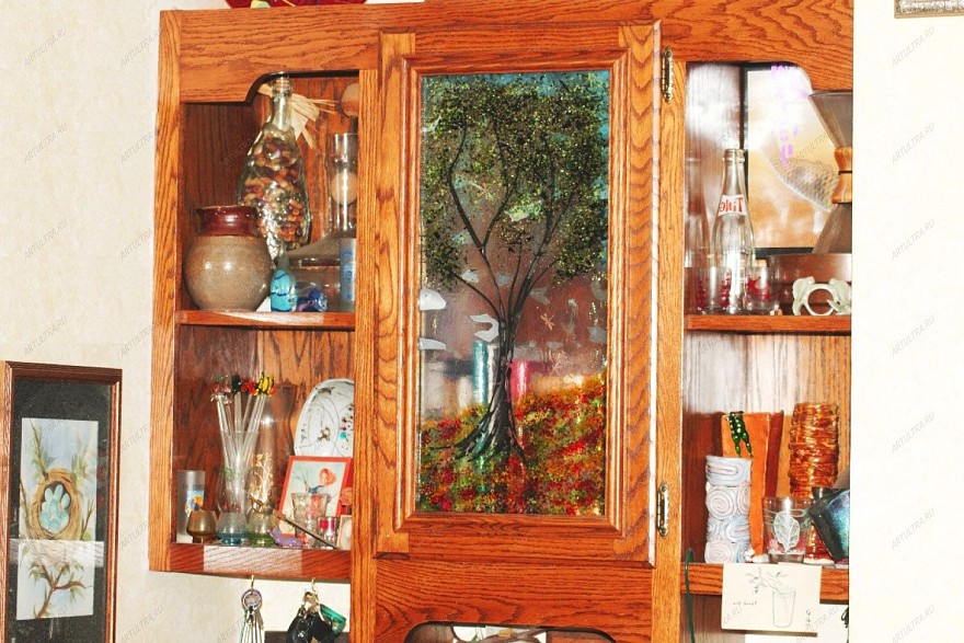 Расположить картину из фьюзинга можно в фасадной дверце шкафа, заменив любую его секцию с прозрачным стеклом. Тем самым получится двойной эффект. С одной стороны вы придадите интерьеру шарма и необычности, а с другой - скроете от посторонних глаз вещи, находящиеся в шкафу. Хочется отметить, что такой способ декора в вашем жилище всегда будет радовать вас и не надоест. Игра света и мерцание стеклянных фрагментов картины будут привлекать ваше внимание своим оригинальным видом. Вам останется только любоваться этим ее великолепием.