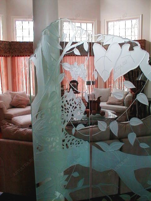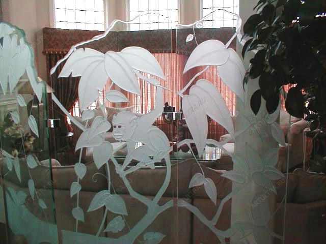 Изображённые на витраже в стиле модерн джунгли с лианами и характерными для них обитателями, станут прекрасным дополнением интерьера спальни, зала или гостиной. На рисунке преобладают плавные, сложные линии, которые делают изображение более интересным и необычным. Подобные картинки пескоструем схожи с привычными зимой морозными узорами. Данная композиция добавит помещению атмосферу загадочности, легкости, тепла и уюта, а ширма скроет ненужное от чужих глаз.