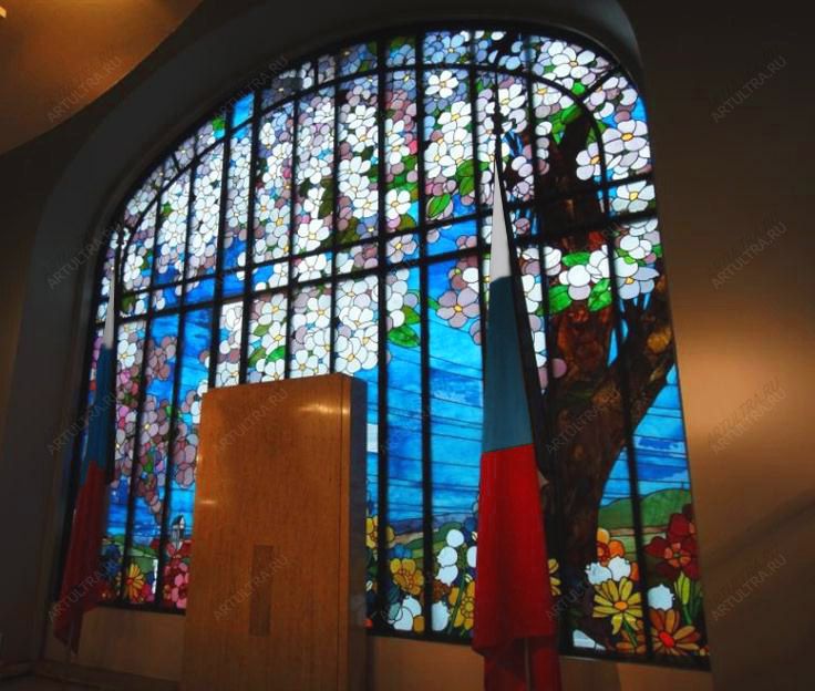 Такое витражное окно с картиной цветов и веток сакуры подходит для учреждений с высокими потолками. Очень интересно решение дизайнера, выбравшего это изображение для декора серьезного общественного заведения. Не меняя тональности интерьера на неуместно игривую, картинка сакуры на витраже несколько разбавляет официоз обстановки. Если посмотреть на рисунок полотна с точки зрения эстетики, то можно уловить позитивные нотки, цветовая гамма довольно-таки разнообразна и при этом не криклива. Витраж гармонично вписывается в интерьер, а тот образ, который создан на его полотне, напоминает о расцвете, свежести сил, оптимистичном взгляде в будущее. Может быть, именно поэтому картинка сакуры на витраже столь оказалась столь удачным выбором для учреждения с политической направленностью.