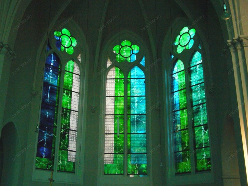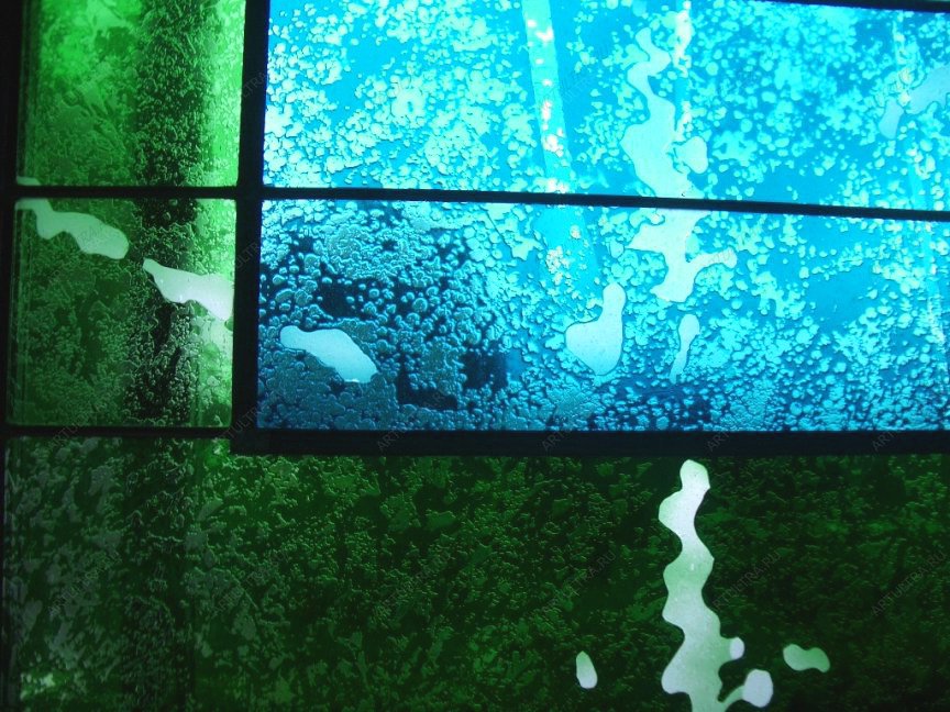 При выборе оконных витражей всегда возникает масса вопросов: надежные ли они, как будут смотреться после установки, не сделают ли они помещение визуально меньше. Заказав витраж, изображенный на фото, обо всем этом можно не беспокоиться. На вышеперечисленные вопросы можно смело ответить, что это самый удачный вид витражей для оконных проемов благодаря продуманному проекту, включающему не только визуальную, но и техническую сторону разработки характеристик изделия. Такие цвета, как зеленый и синий, действуют успокаивающе, придают строгость обстановке Витраж в современной консерватории, если отойти от надоевших норм, может быть именно таким.