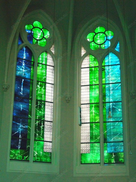 Витраж в консерватории – это своего рода давняя традиция, поскольку издавна подобный декор является атрибутом торжественного, роскошного стиля. Авторы витражных полотен на фото решили отойти от классического видения этого явления и воспользовались удивительной возможностью привнести в интерьер мотив некоего подводного мира. Сочетание зеленого и синего цвета позволяет вспомнить водную глубину, кажется, что в таком зале всегда прохладно и царит особая атмосфера. Хотя витражное полотно не имеет четко обозначенного рисунка, смотрится он очень красиво и необычно, эклектично сочетаясь с высокими потолками и традиционной готической формой окон.