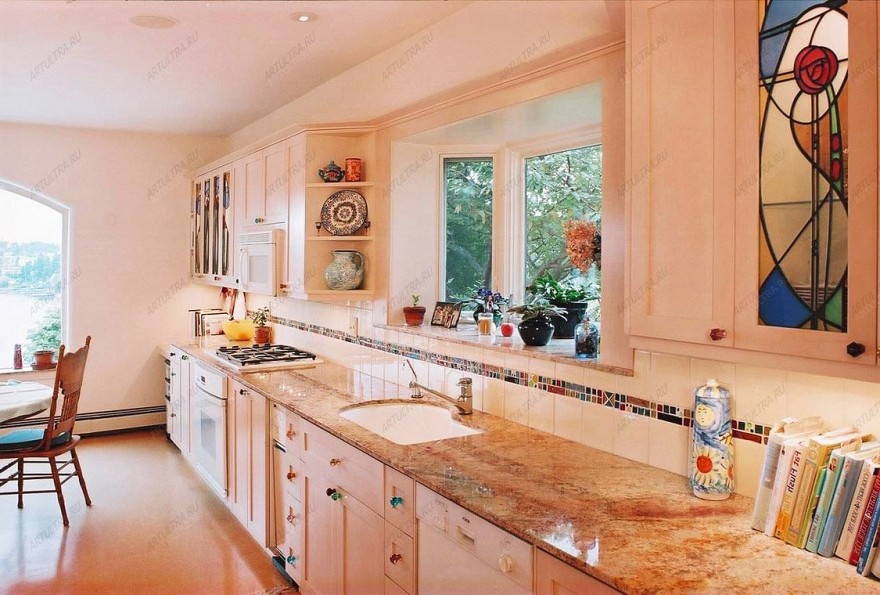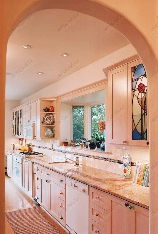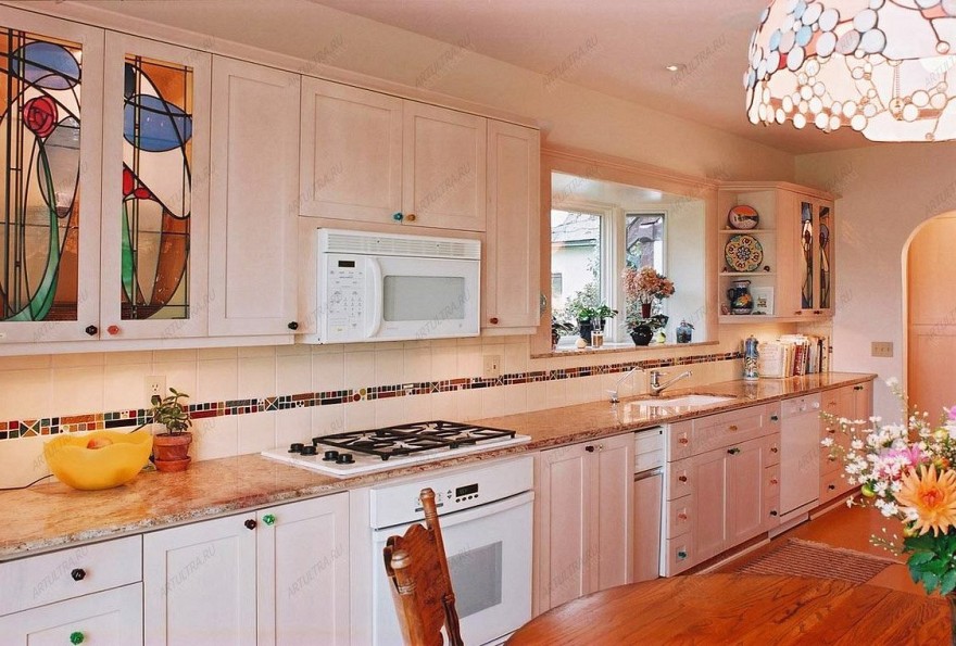 Кухонные витражные фасады мгновенно превратят обычный интерьер в эффектный и волшебный. Установив такой декор на дверцах шкафов кухонного гарнитура, помещение буквально заиграет множеством великолепных оттенков, создав сказочную обстановку. Кроме того, применив его в качестве дополнения к дизайну, он подчеркнет не только изысканность вашего вкуса, но и ваш достаток. Ведь техника Тиффани, в которой выполнено изделие, очень эксклюзивна, высококачественна и соответственно, не из дешевых украшений.