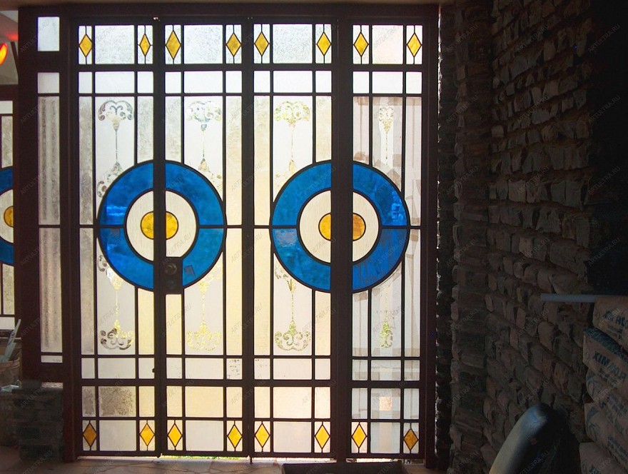 Довольно простой и незамысловатый абстрактный рисунок с изображением абстрактных фигур не выглядит аляповатым. Примечательно, что сочетание синего и желтого цветов является одним из удачных и наверняка повлечет повышенный интерес к витражу. Такой цветовой союз вызывает у человека приятные и радостные эмоции. Кроме этого он повышает кровяное давление, активизируя работу пищеварительной и эндокринной систем. Легкие витражи, выполненные в технике пескоструй, выглядят без излишеств, а использование ярких и насыщенных красок создает весьма эффектное впечатление, благодаря которому такой витраж невозможно оставить без внимания.