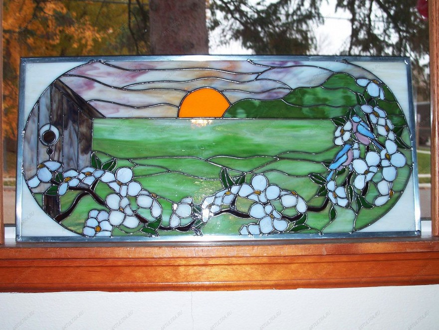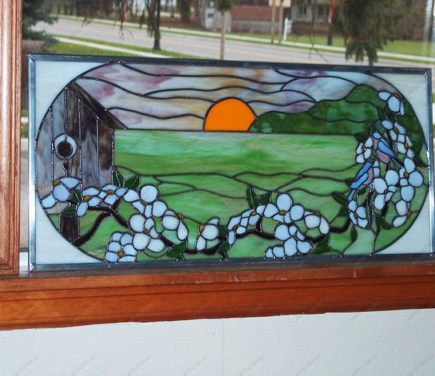 Луг в витраже на окне– удивительно красивый и изящный декор для вашего интерьера. Не секрет, что от оформления окон зависит многое, т.к. они – одни из первых, на что обращают внимание при входе в комнату (квартиру). Очень важно правильно подобрать витражную технику для их декора, а также тщательно разработать эскиз, который бы органично вписался в стилистику интерьера.