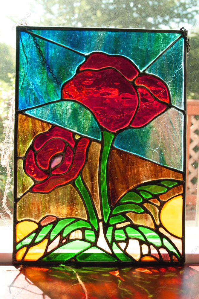 Маки на витраже выполнены в классическом стиле. Никакой абстракции или вольностей, только строгие плавные линии и точно подобранные цвета. Такую картину можно поместить в любую комнату дома: спальню, кухню, гостиную, детскую. Композиция гармонично войдет в любой дизайн помещения и придаст ему умеренную яркость и оживление.