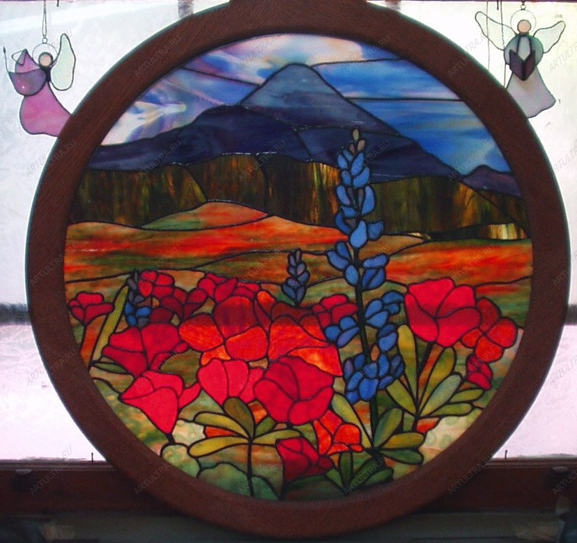 Пейзаж изображает цветущее поле маков и ирисов на фоне гор. Величественная красота картины облагородит кабинет или гостиную. Яркие оттенки будут красиво играть в лучах солнечного цвета, а в пасмурную погоду порадуют глаз, скрыв серое мрачное небо за окном. Картина выполнена из 79 деталей тщательно подогнанными друг к другу при помощи стеклореза. Специальная обработка стекла позволила сделать витраж более прочным, а за счет оловянного припоя и ленты из меди картина надежна и долговечна.