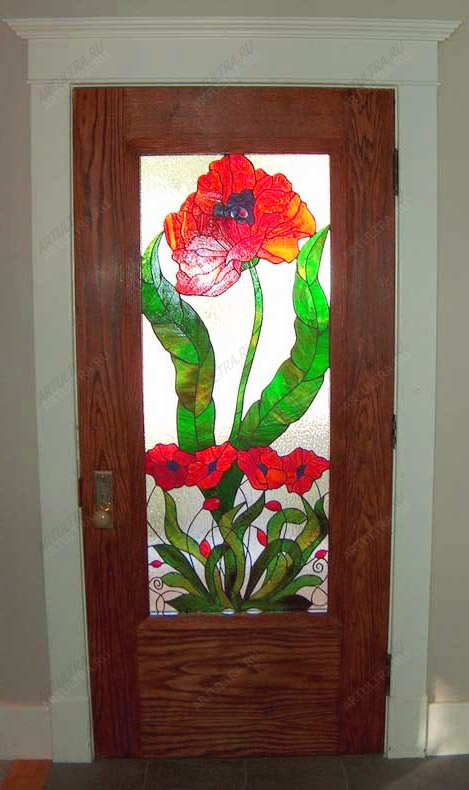 Мода на витражные двери пришла в Россию еще в восемнадцатом веке, но по сей день, такое украшение является признаком достатка и хорошего вкуса, поэтому витражи не теряют актуальности. Маки являются символом плодородия, покоя и здоровья, поэтому изображение этого цветка, полезно иметь в любом доме.