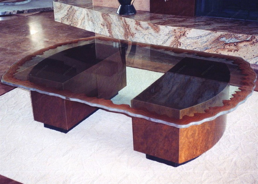 Из всего имеющегося сейчас многообразия наиболее эффектно и оригинально выглядит стол, столешница которого выполнена из прочного многослойного стекла и украшена с помощью машины для пескоструя. Для создания неповторимого эффекта, края столешницы украшены росписью из акриловых красок, удачно сочетаясь с оттенком древесины, используемой для изготовления ножек стола.