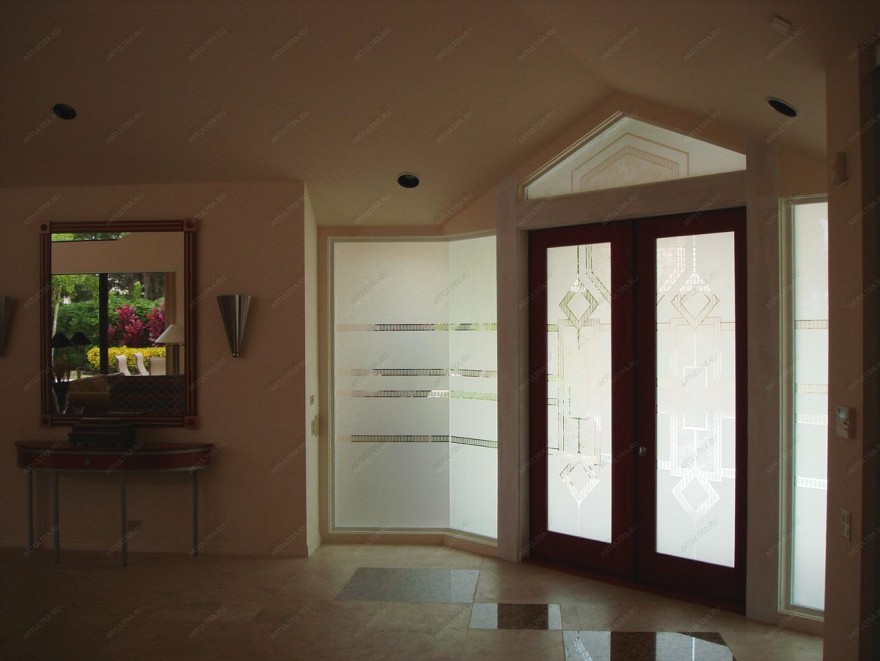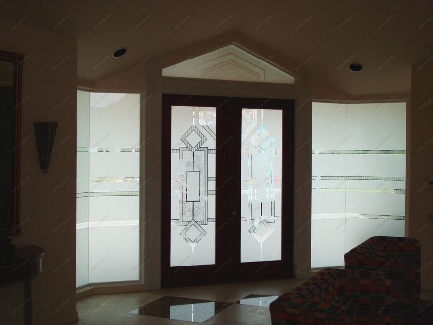 Используя различные трафареты с рисунками и узорами, можно выполнить на стекле имитацию известной картины или портрет члена семьи. А можно остановиться на строгой матовой геометрии, как в примере на фото. Такой орнамент относится к средней категории сложности, и услуга по его нанесению вполне доступна по стоимости. Сочетание матового фона и прозрачного рисунка придает особую легкость дизайну двери и межкомнатной перегородки, дополняя цельностеклянную конструкцию последней. Двустороннее нанесение создаёт эффект объема и глубины рисунка, а также избавляет от эффекта «изнанки» в одном из помещений. Стоит отметить, что после пескоструйной обработки повышается устойчивость поверхности к механическим повреждениям.